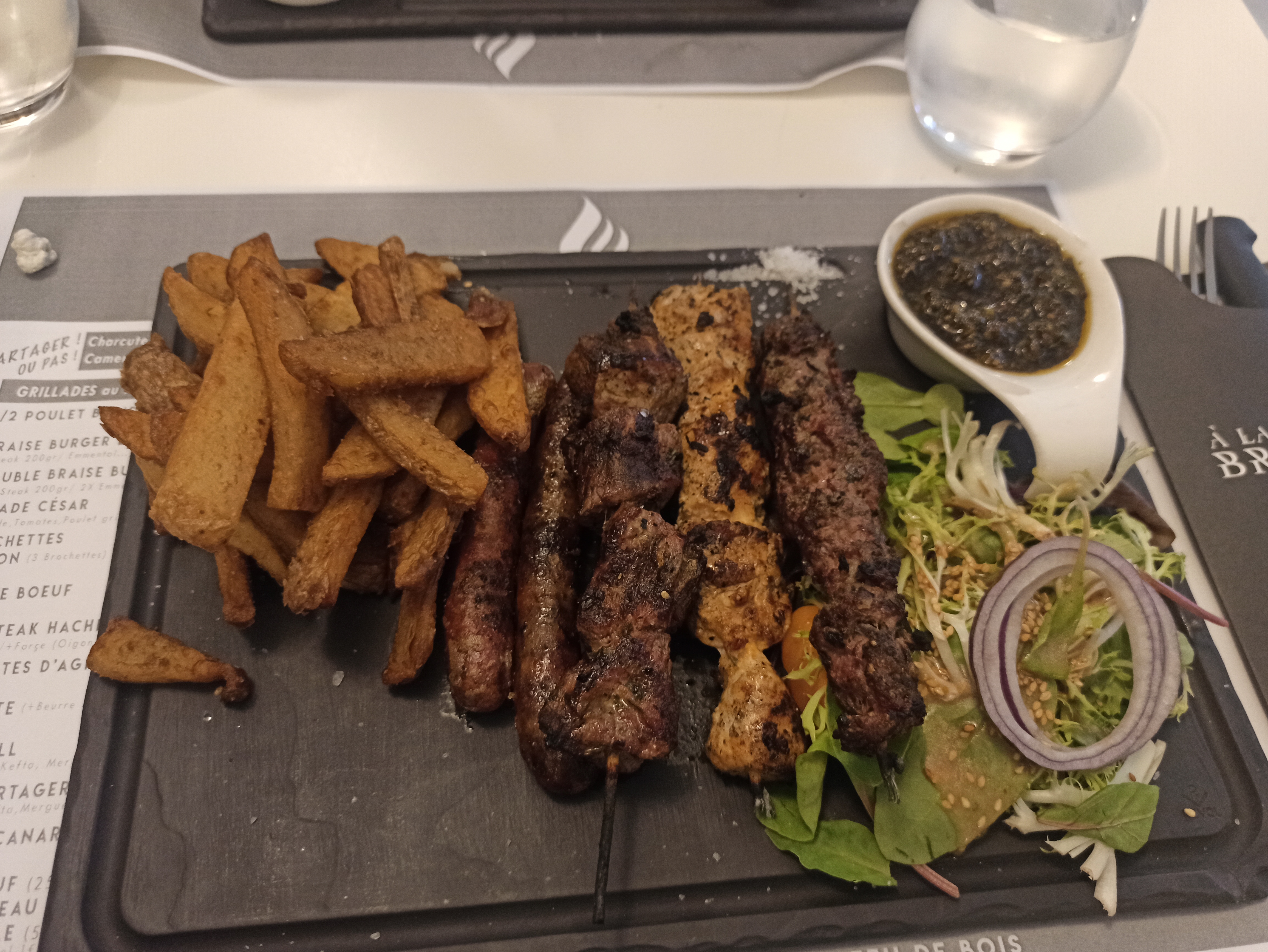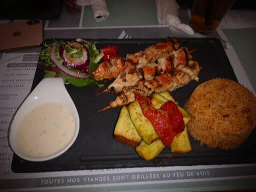 Bon rapport qualité prix mais pourrait devenir excellent ! Serveuse sympathique, cadre agréable. Un plateau de viande grillé qu'on vous présente avec de bonnes frites et de la salade. Sauf qu'il y avait quelques bémols pour que ça soit parfait : viande trop cuite et caoutchouteuse pour certaines :/ Donner au client une planche avec de la viande dégoulinant de sang ça refroidi. Donner des légumes grillées à moitié cru et revoir la sauce verte qui est une sauce salade plutôt qu'une sauce d'accompagnement pour le poulet. On était pas beaucoup de client et toutes ces remarques dénotent un ras le bol du métier :/ Le monsieur est expéditif il n'a plus rien d'humain on sent juste vous allez payer ? Hein vous allez payé ?? Hein ? Hein ? Bref j'écris cette avis pour permettre à une reflexion Hein ?!!!