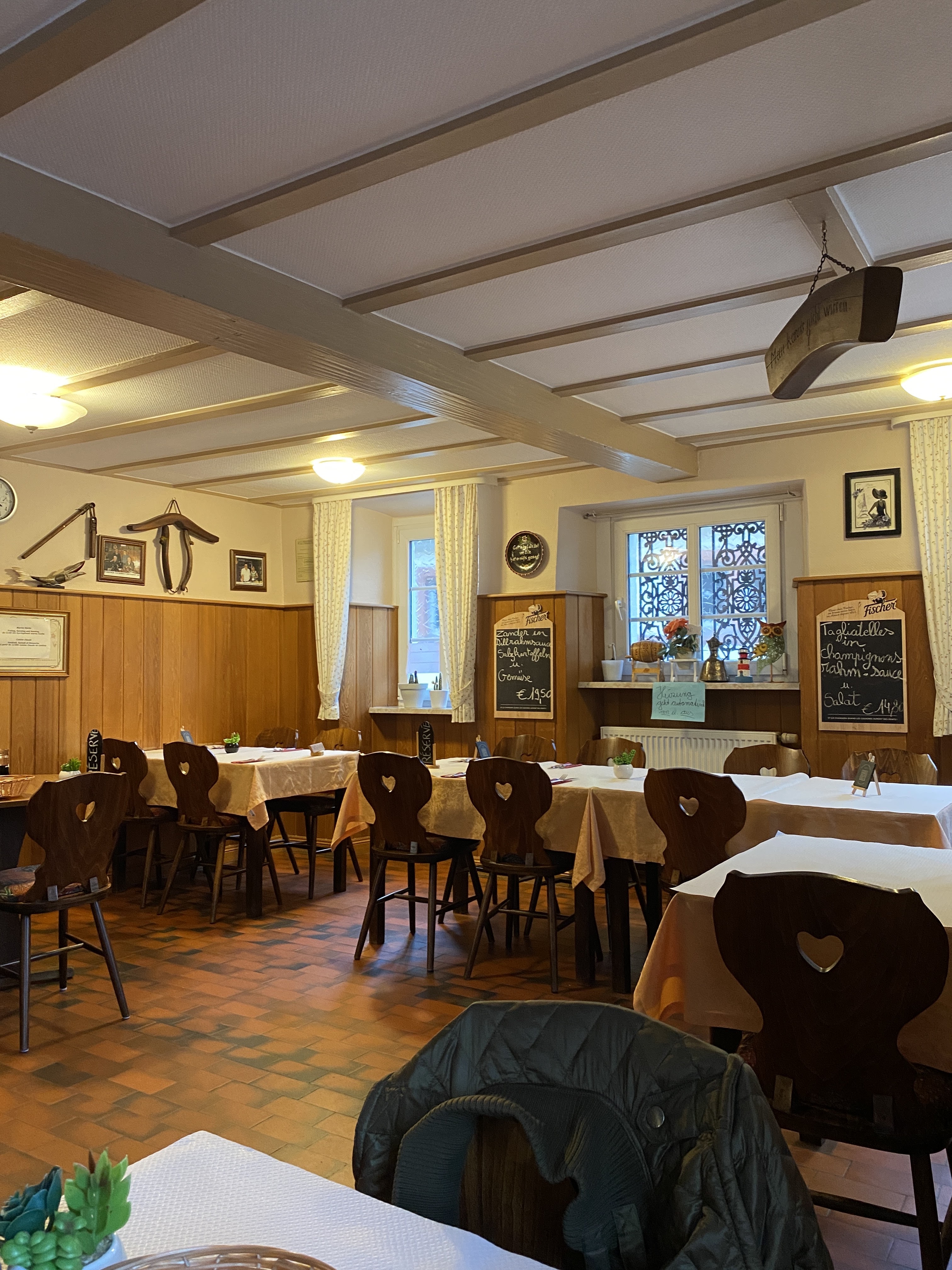 Petit restaurant bien agencé dans le style ancien à colombages, le café en plein air est une entrée aménagée mais avec un toit en plexiglas. Le personnel de service était très sympathique et avait une aura agréable. La nourriture et les boissons sont arrivées rapidement et étaient bonnes. Pour les amis exotiques qui aiment 🐌 les escargots, il y a aussi des cuisses de grenouilles au menu. Malheureusement, je ne peux pas évaluer ce dernier car je n'ai pas pu le goûter. Mais je peux le recommander.