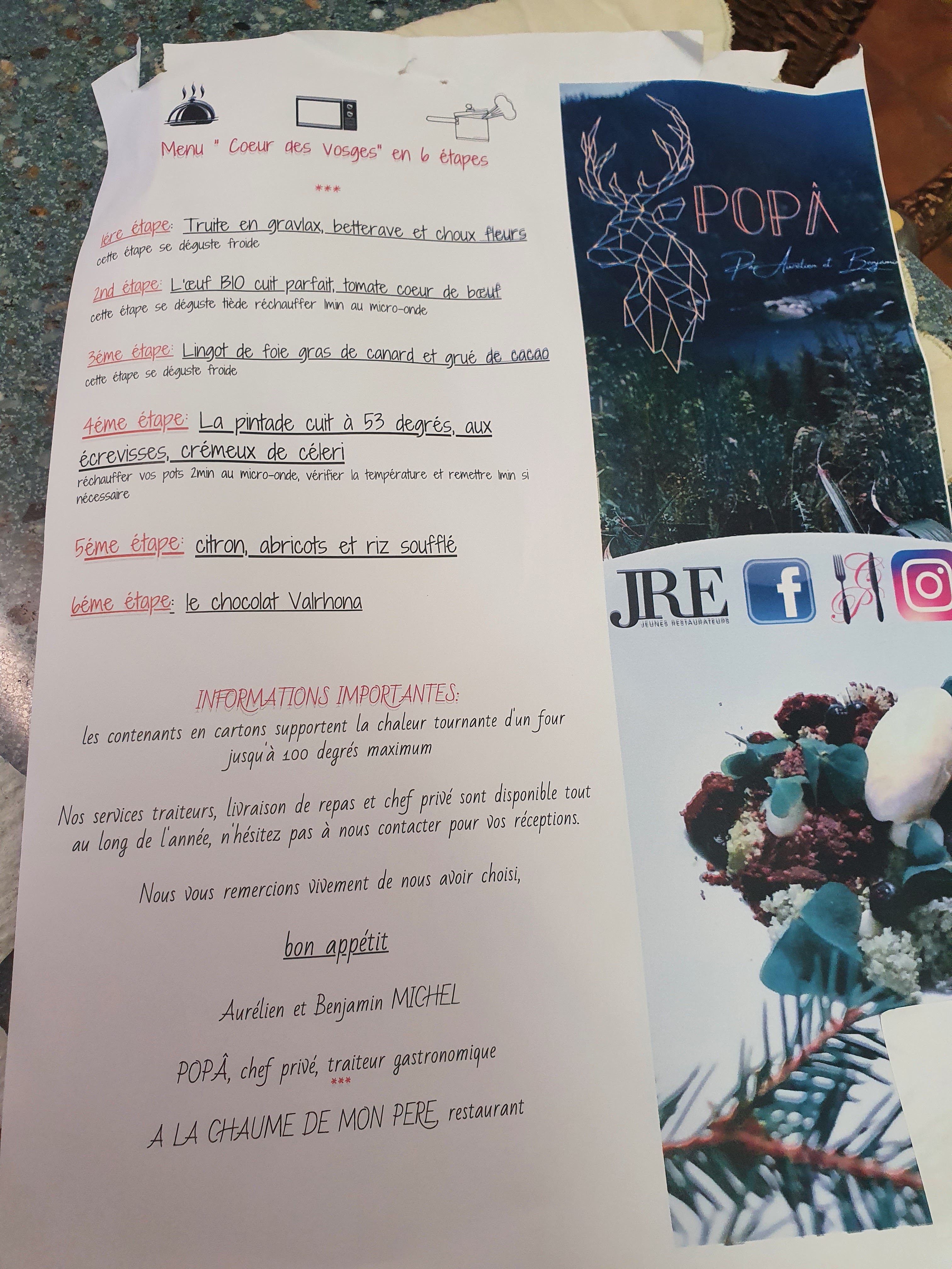 Merveilleux ! Testé en livraison le menu cœur des Vosges en 6 services, Tout est parfait ! La livraison dans les temps, la présentation en bols recyclables et réchauffables, l'étiquetage, les conseils de préparation à suivre à la lettre ( j'ai réchauffé à 90° en four traditionnel plutôt que micro-ondes). Les saveurs sont bien présentes, les textures parfaited, le goût idéal, ne manque que le service 😉 En ces temps compliqués avoir un menu bistronomique chez soi c'est un pur bonheur. Merci à l'équipe pour ce dîner d'anniversaire surprise 🥰 Je recommande gustativement 😋