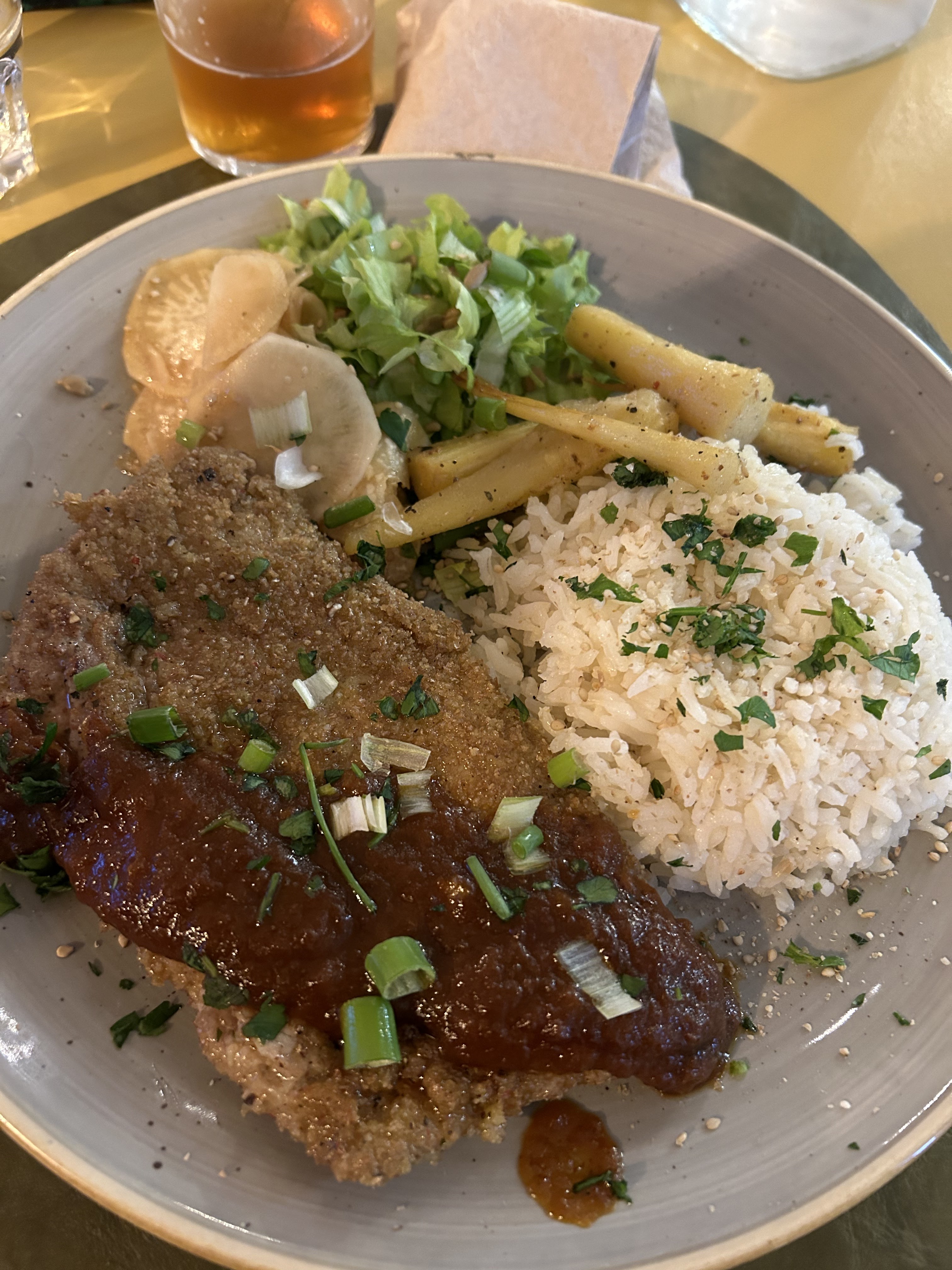 Nous avons pris une assiette végétarienne et en dessert un pavlova, des sorbets. L'assiette était très complète, agrémenté d'un assortiment de légumes frais et de saison avec du riz. C'est très appréciable de trouver des assiettes végétarienne savoureuses ! Les desserts étaient très parfumés, un superbe équilibre entre les saveurs. Le serveur était chaleureux et accueillant. Nous nous sommes régalés et avons passés un super moment ! Merci !