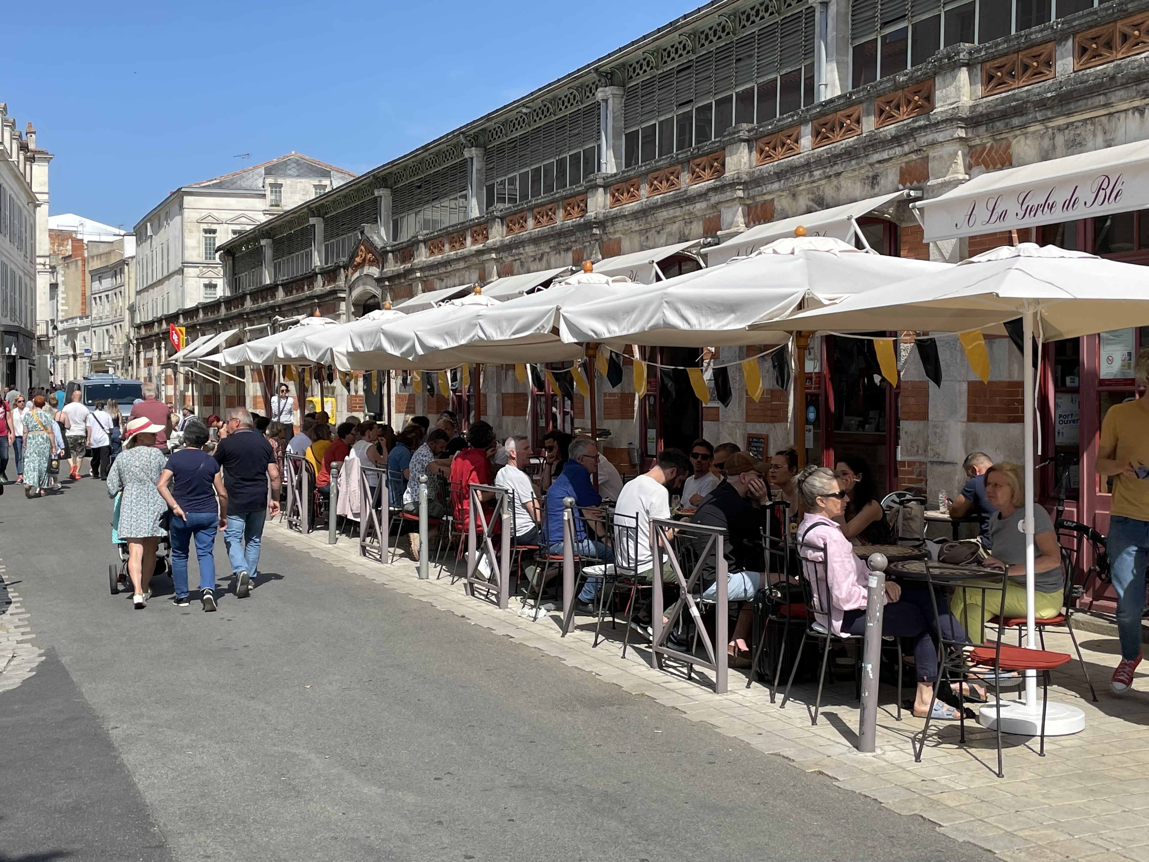 Simple et efficace ! Vous allez chercher vos petites huitres sur le marché de la Rochelle, pâté, charcuterie et autres fruits de mer, et vous vous installez à La Gerbe de blé ou serveurs et patrons vous fourniront le reste : Pain, vin, etc. Avec une convivialité au top !