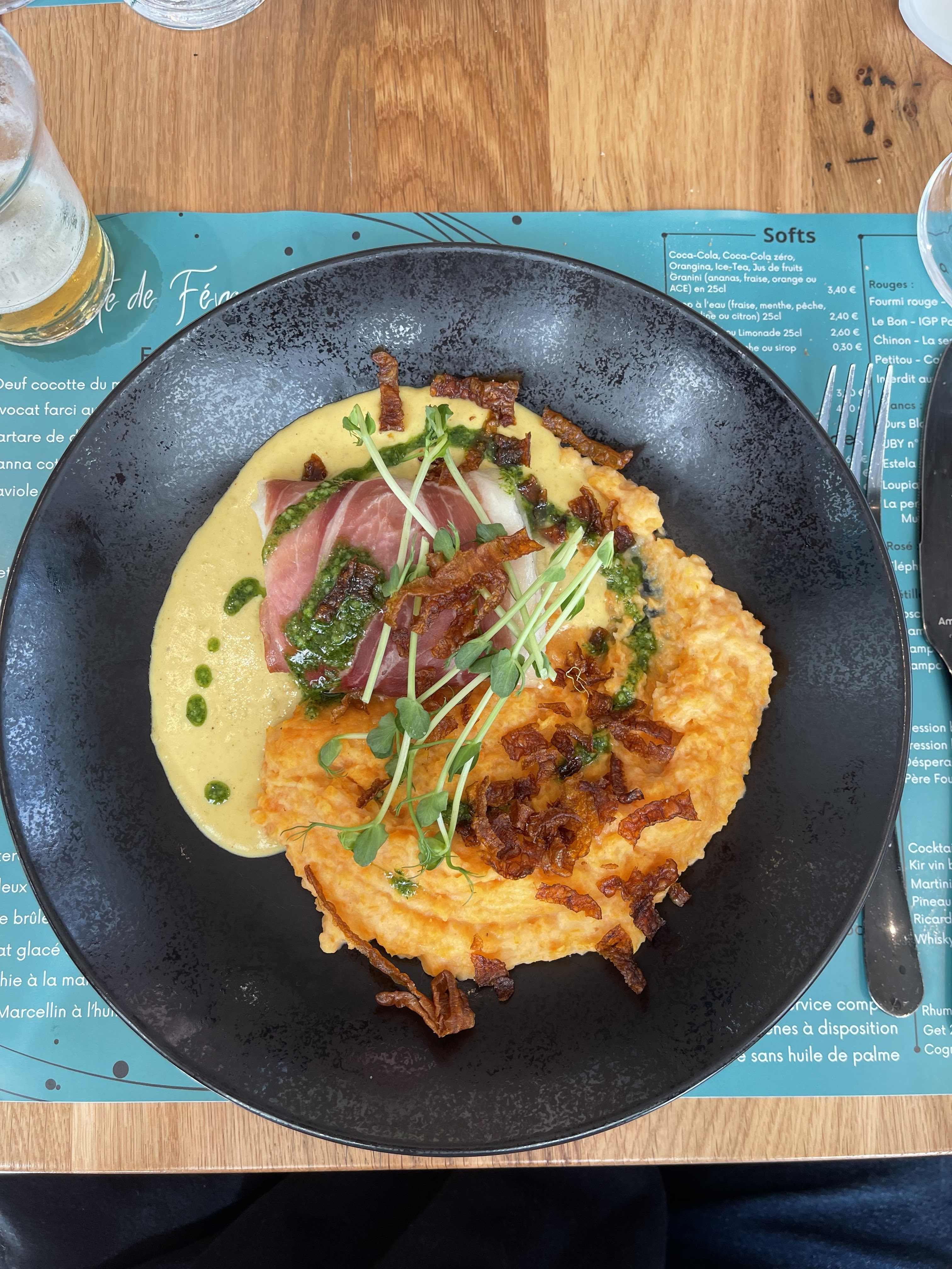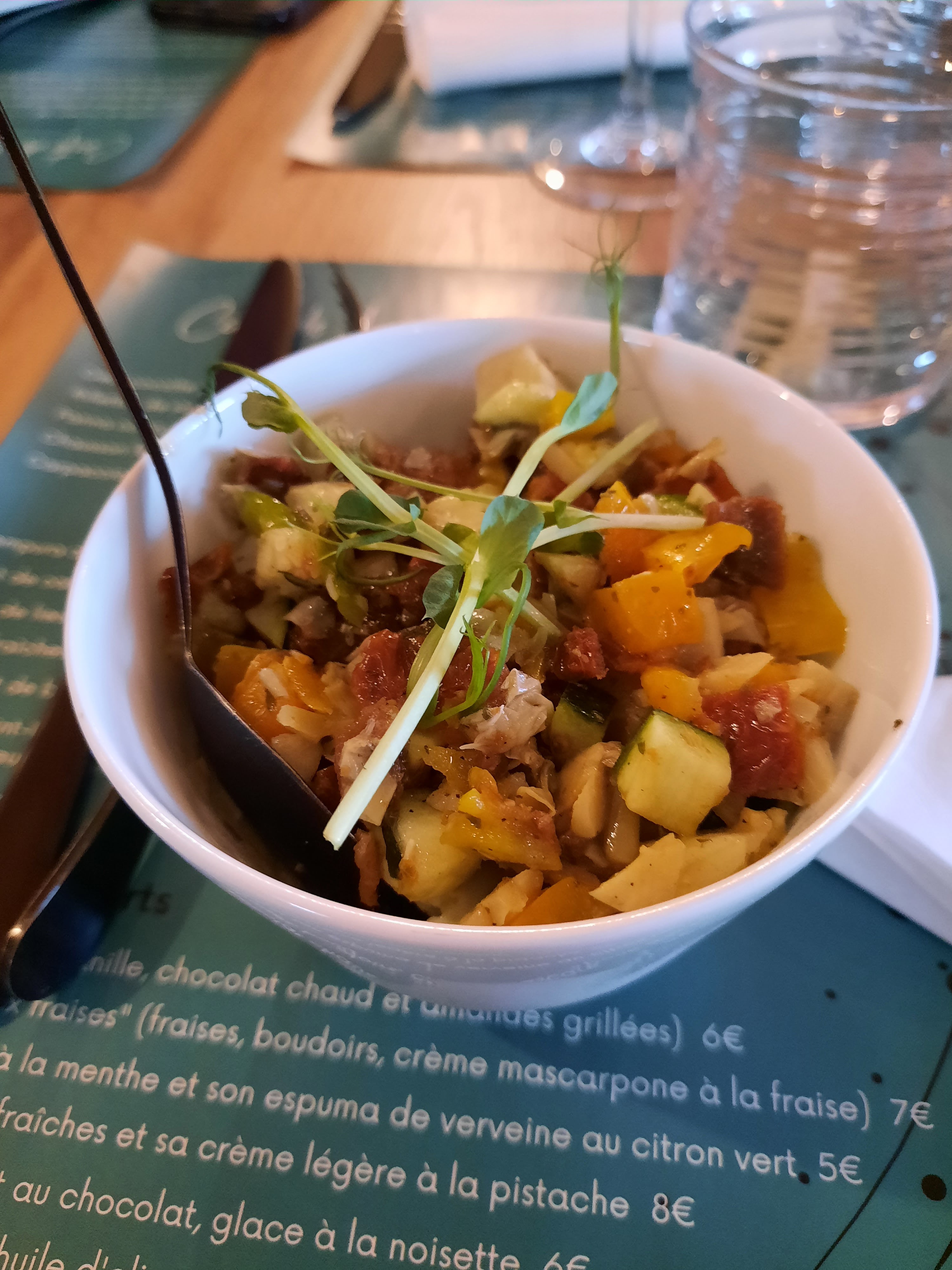 Très sympa déco intérieur Très bonne cuisine originale,délicate et succulente Le nougat de chèvre très bon état surprenant La profiterole excellente,le.chocolat maison une tuerie Je reviendrais car pleins de choses a essayer Et l'originalité de ce lieu c'est le changement de carte tous les mois.