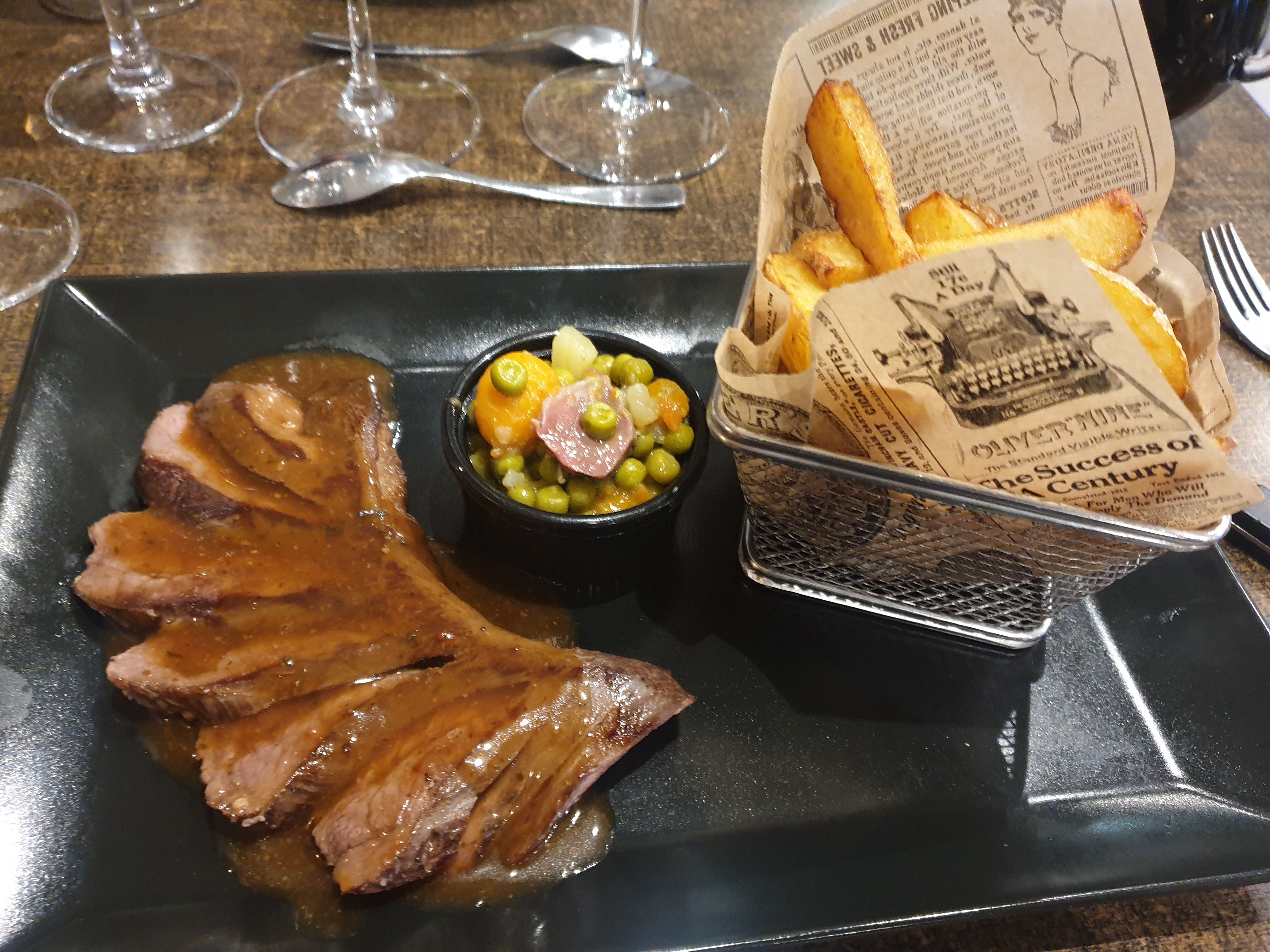 Superbe accueil personnels très agréables et professionnels. Pour ma part j'ai pris une entrecôte saignante la viande est de qualité les accompagnent étaient excellent surtout le petit ramequin de petits pois !!!! Enfin bref je recommande ce petit restaurant plein de charme !