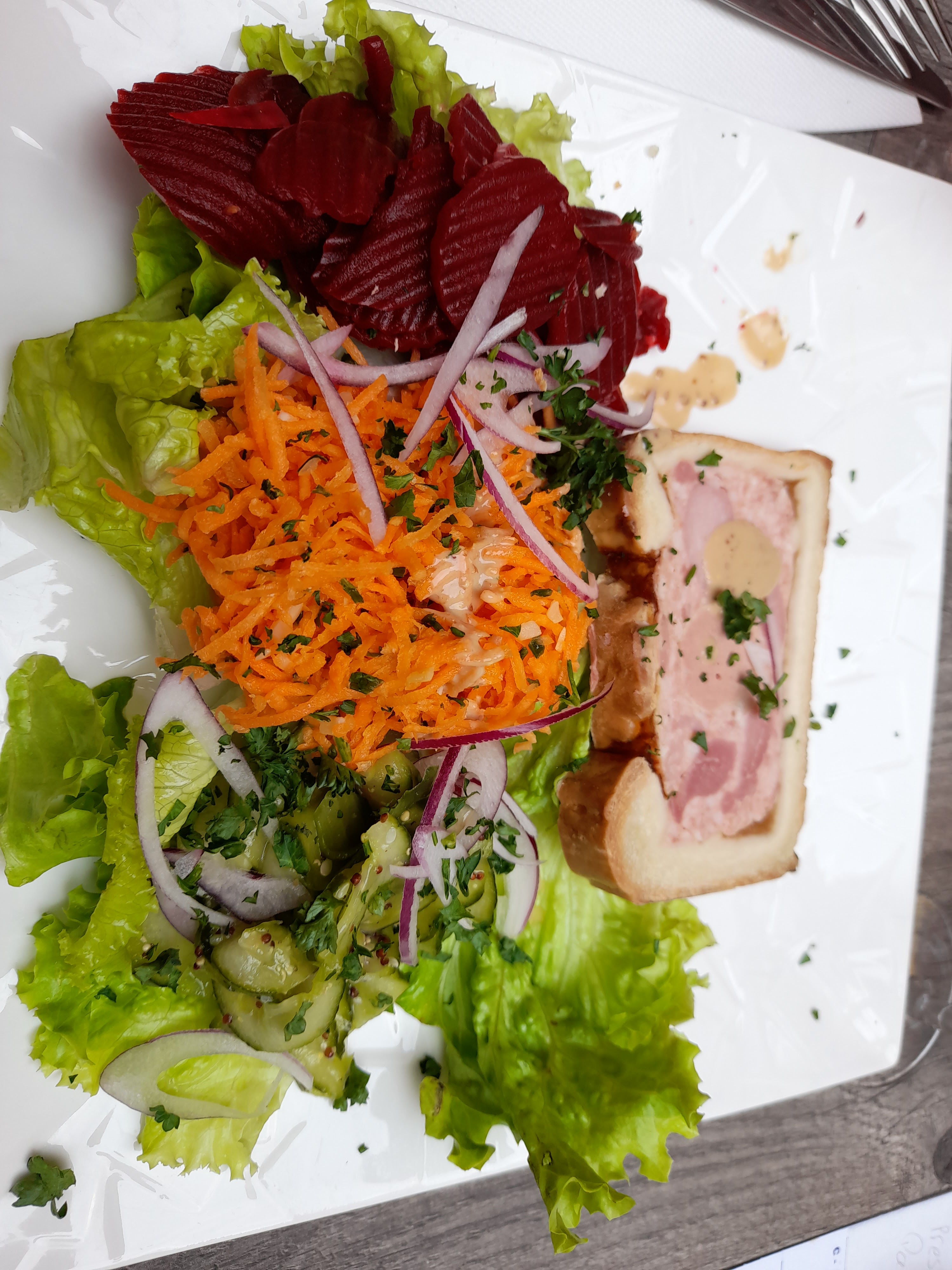 Ce soir j'ai pris un carpaccio de bœuf, frites, salade 🥗, j'attends toujours ma salade après 3 demandes à la jeune fille plus pain au bout de la 3ème fois j'ai eu le pain mais toujours pas de salade....!! Repas bon , la tête de veau était bonne malheureusement il y avait en accompagnement 3 toutes petites pdt vapeur c'est tout et mr avait fini toute son assiette quand le pain et arriver.... Dommage pour le dessert les jolies tartes myrtille, rhubarbe et fromage blanc que j'ai vu en allant payer au bar ne nous a pas était énoncé lors de la demande de dessert ont en aurait pris volontiers....!!