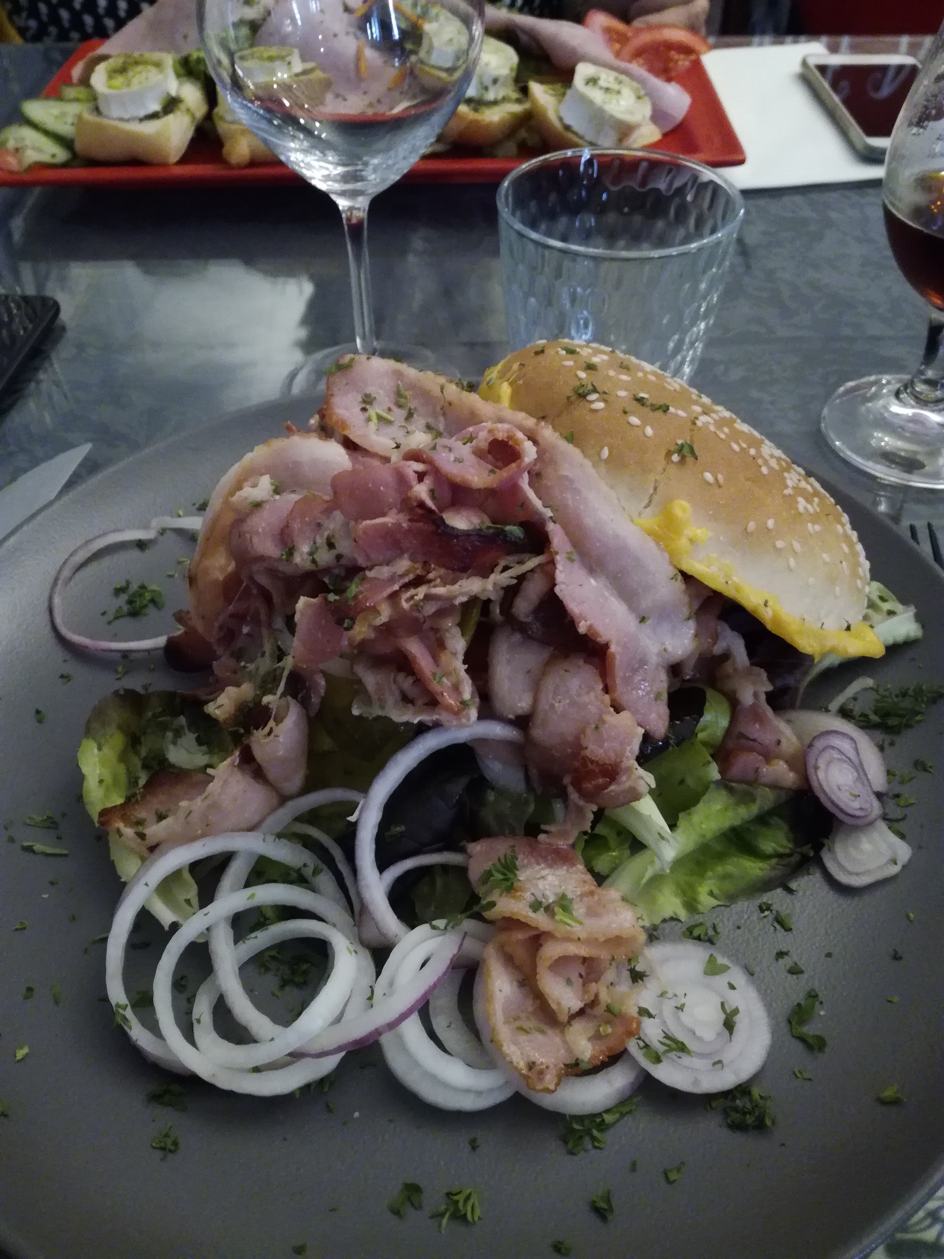 Entrés ici alléchés par les bouchées à la reine annoncé en plat du jour... Nous finirons par choisir le Burger Alsacien; pain bun maison, steak haché de bœuf copieux et cuit comme il faut, sauce au munster à tomber et galette de pomme de terre qui donne un côté gourmand croquant au tout ! Wow, de bons produits bien cuisinés, bravo aux cuisiniers. Mon regret... Ne pas avoir choisi le Bäckehoffe (vu trop tard dans l'assiette des voisins !) Le service est attentif et souriant. L'ambiance est un brin trop sombre à mon goût, dans ses teintes grises. 38.50euros pour 2 burgers et 1n2 eau plate