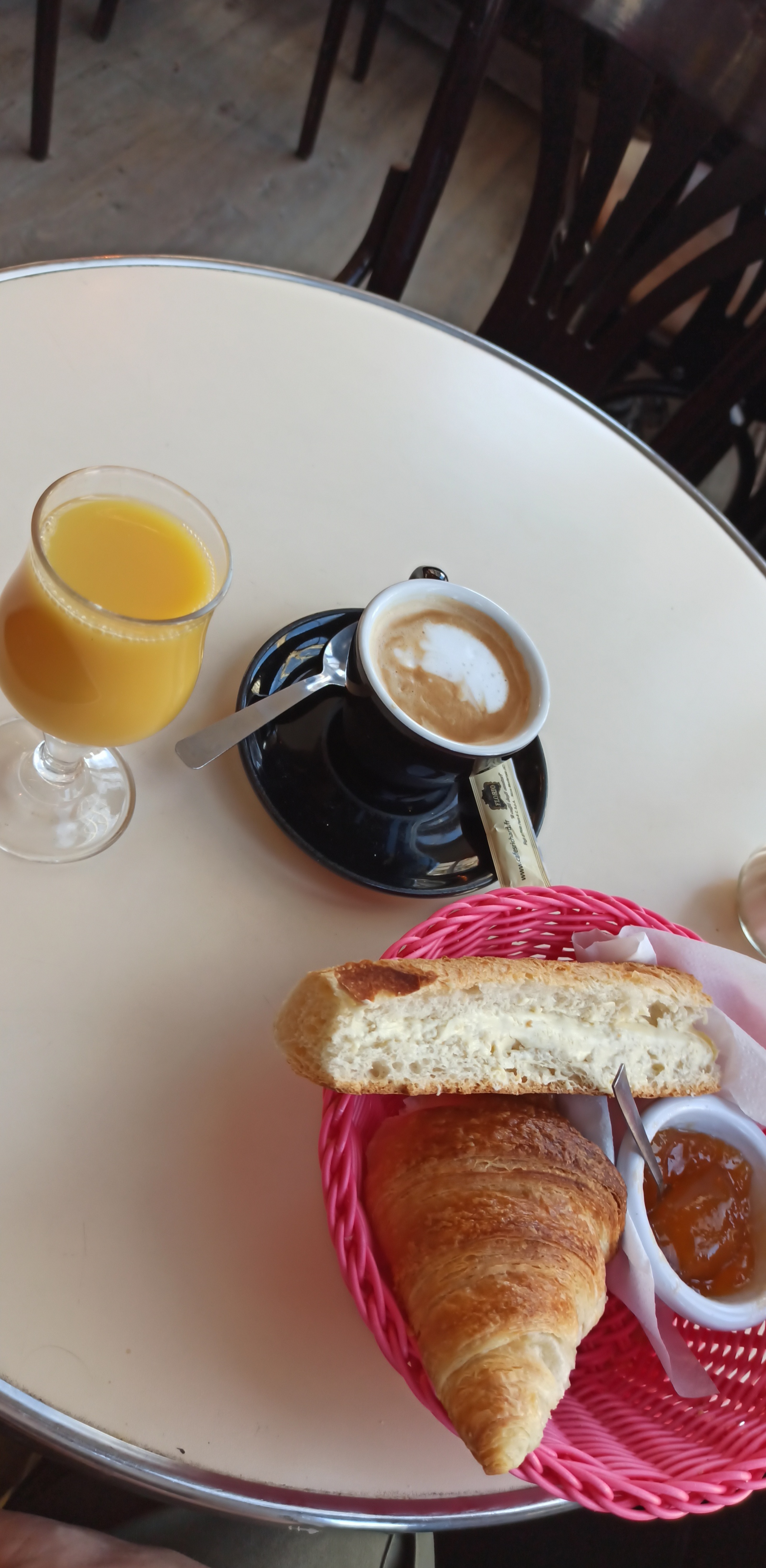 Petit déjeuner pour 6.30 euros - boisson chaude thé ou café, 1 verre de jus d'orange, 1 tartine beurré et confiture + croissant- bar brasserie restaurant un des moins cher à côté de la gare de l'est. Bon service également endroit propre et tranquille...
