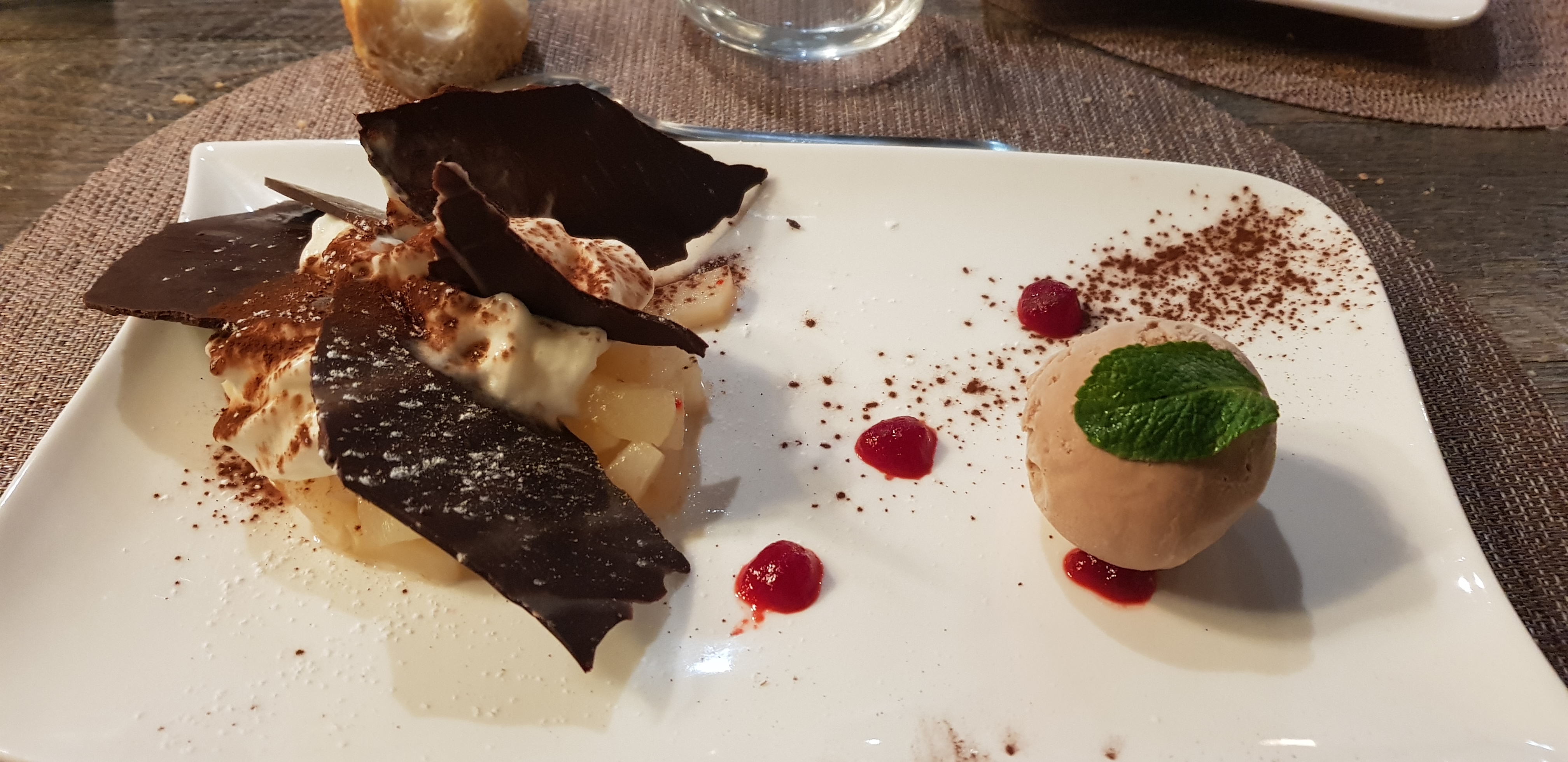 Très bon accueil personnel agréable et souriant Table et assise confortable Manque d’amuse bouche à l’apéritif Bon repas mais dessus par le dessert marquise chocolat et dôme fraise riche en gélatine pas sûr que se soit du fait maison