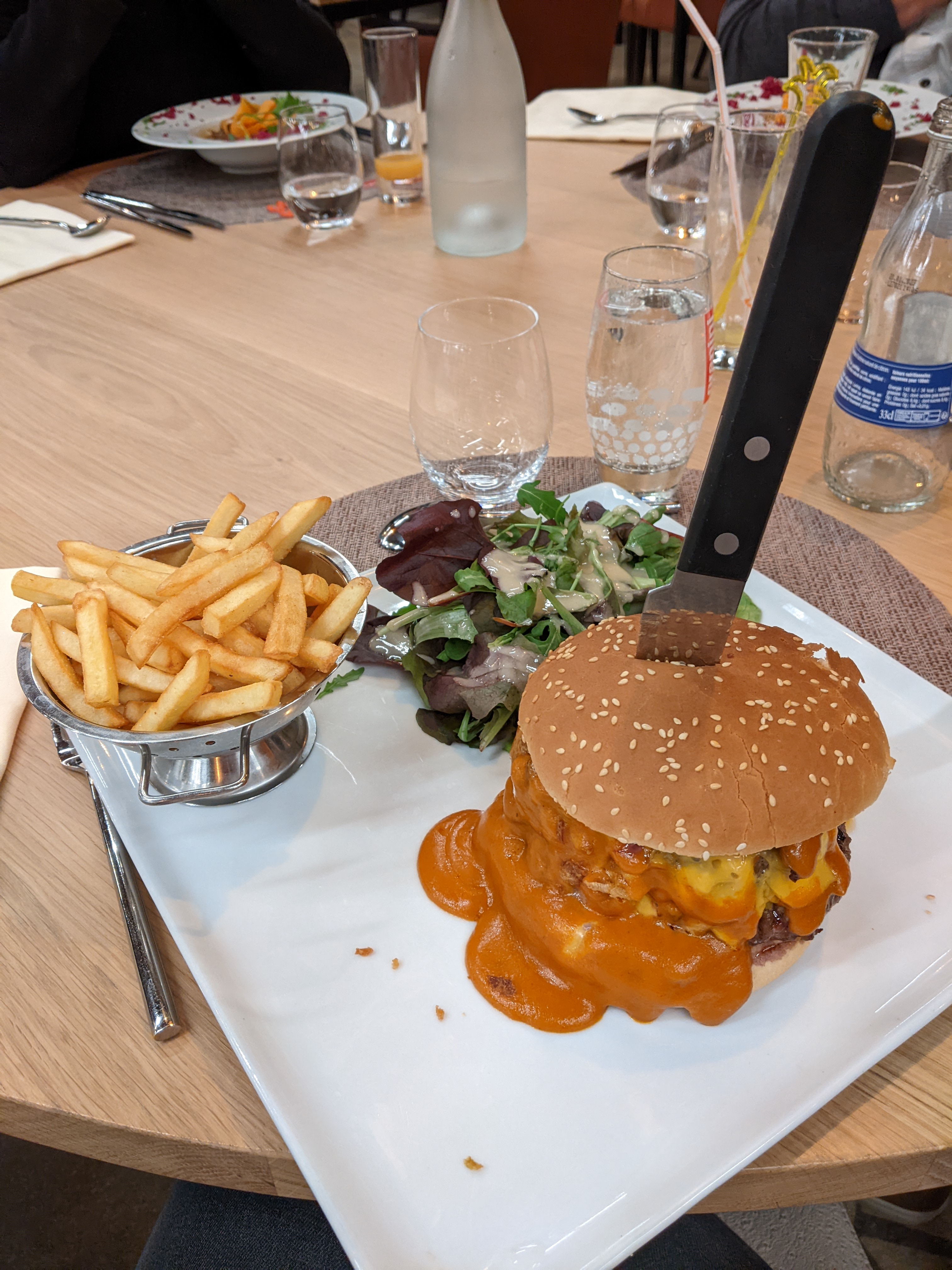 3 gins tonic servis et une seule petite bouteille de scheppes...Un peu light en termes de gestion de stock !! Quelques miséreux amusé bouche...gâteaux secs et coupelle de guise de verinne pour 14 personnes !! On oublie de nous demander la cuisson de steack pour les burgers ...allez hop ce sera pour tout le monde pareil 😡..Sans oublier qu'on a à peine le temps de finir son plat que les serveurs debarassent déjà 😡😡 A croire que l'on dérangeait d'être venus manger....Dommage car cadre sympa