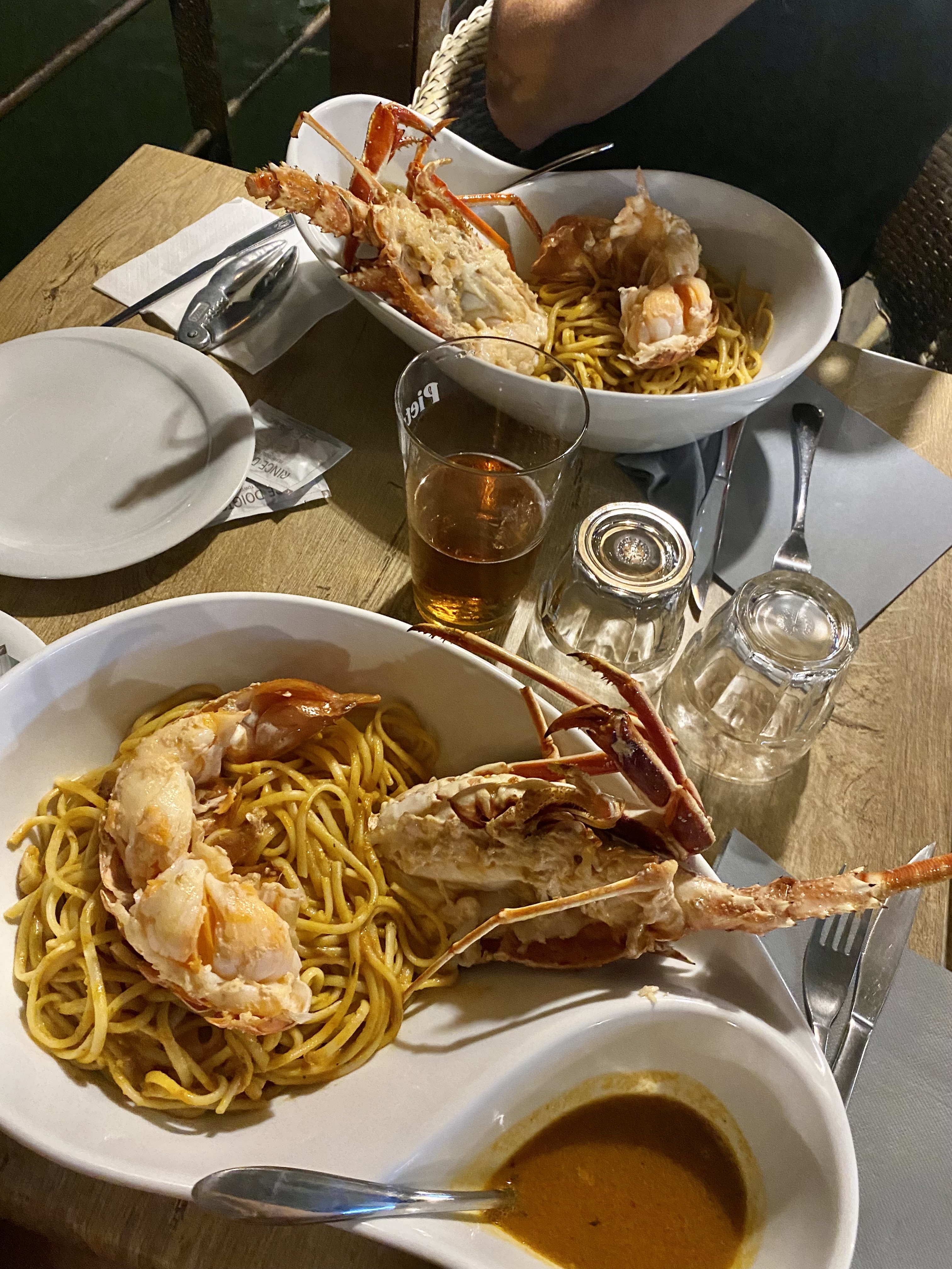 Très déçue. Nous venions manger moules frites. N'ayant plus de moules le serveur nous a proposé la suggestion du jour : linguines à la langouste. Il nous précise qu'une portion de 100g de langouste par plat correspond à environ 18 euros. Avec mon mari nous nous sommes laissé tenter. Au final, il est revenu avec une langouste de 1,5 kg fraîchement pêchée qu'il nous a servi en totalité...... Résultat nous avons été contraint de payer une note astronomique pour un plat qui en plus était incipide servi avec au moins 1kg de linguines par personne..... Je regrette vraiment la malhonnêteté du serveur qui nous a plomber notre budget vacances.....