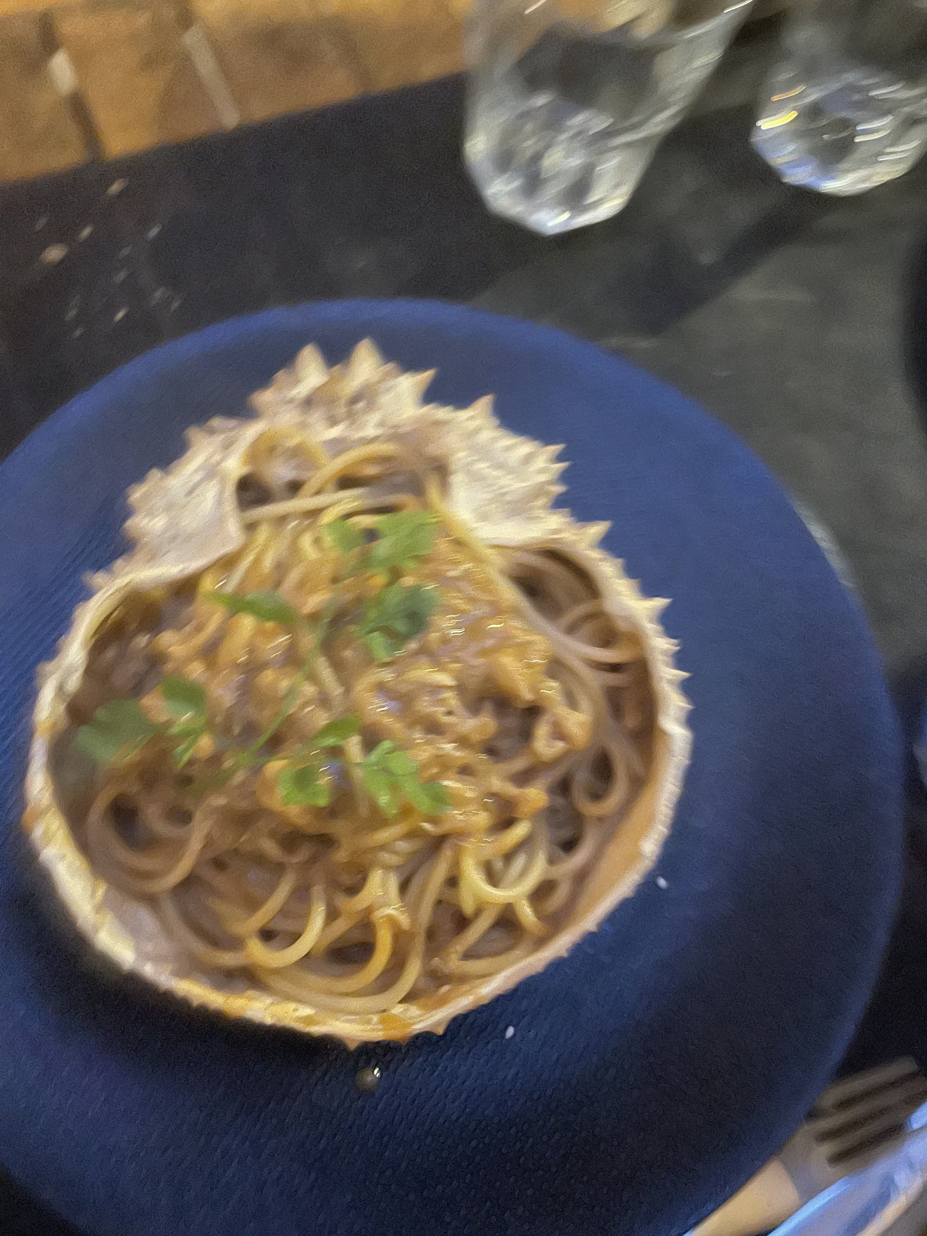 Jolie découverte dans une petite rue Décoration sobre et élégante avec pierres et ampoules suspendues Super accueil ! Du chef à la serveuse Petite carte et donc plats maison et excellents ! Velouté de crabe bleu et linguines à l'araignée un délice. Super adresse, à refaire !