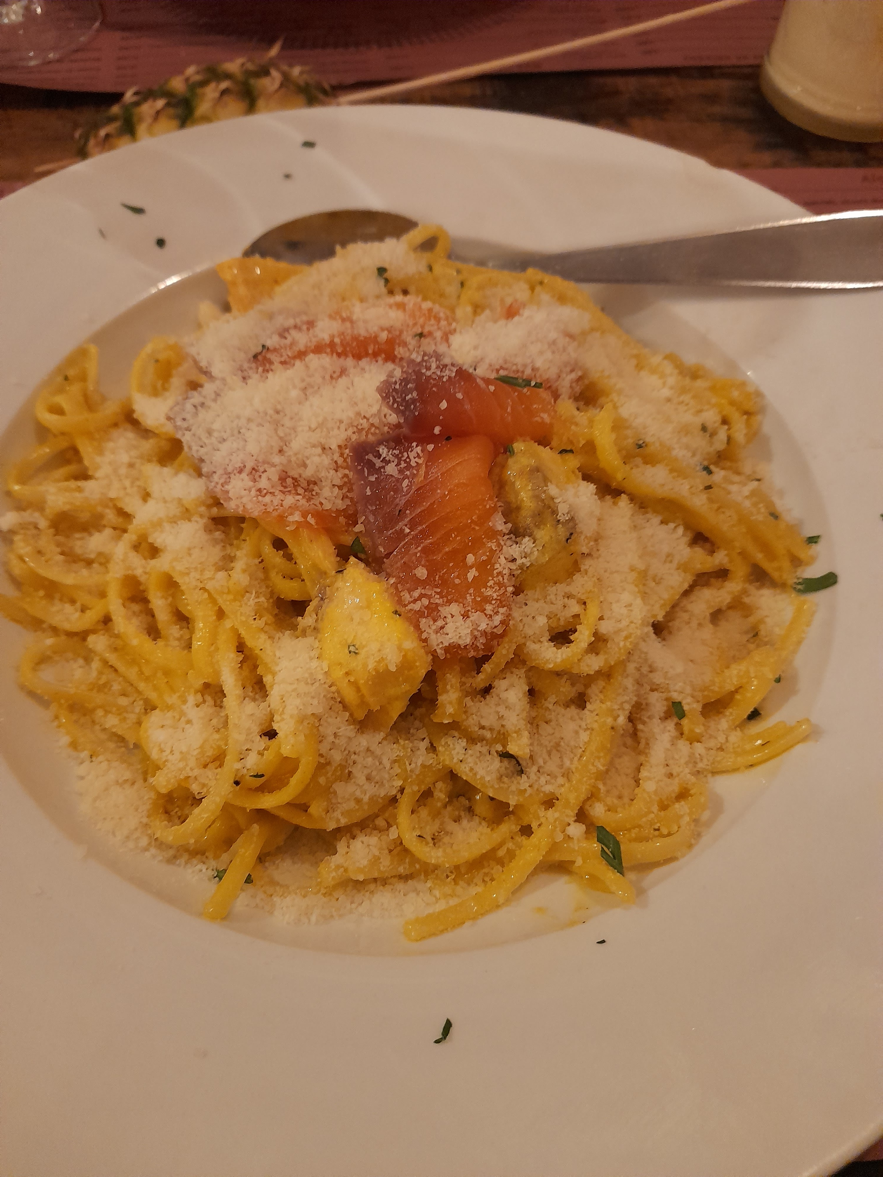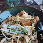Un restaurant à deux pas de la plage, soit à l abri ou sous les arbres. J y vais depuis de longues années et toujours aussi bien reçu autant par le patron que par le personnel. Les pizzas sont délicieuses et cette année une innovation pour la pizza roulé coupé , voir la photo, mais les plats de pâtes sont très bons aussi. Je me suis laissée tentée par les linguines au 2 saumons, un régal et mon fils par la carbonara véritable avec l oeuf dessus. Je conseille pour la famille, entre amis, en couple... Mais en été penser à réserver ou n hésitez pas à faire un tour car souvent complet.