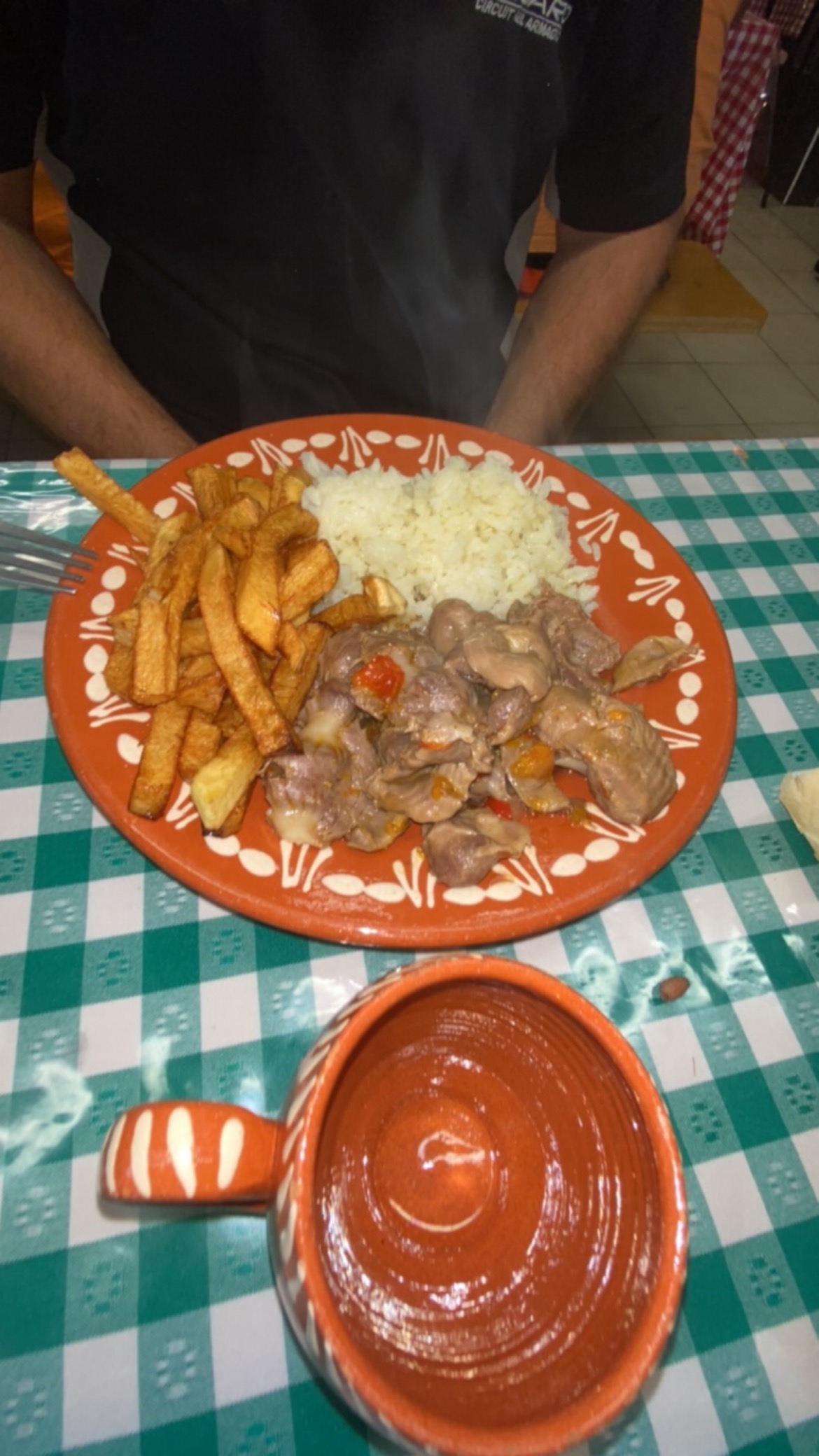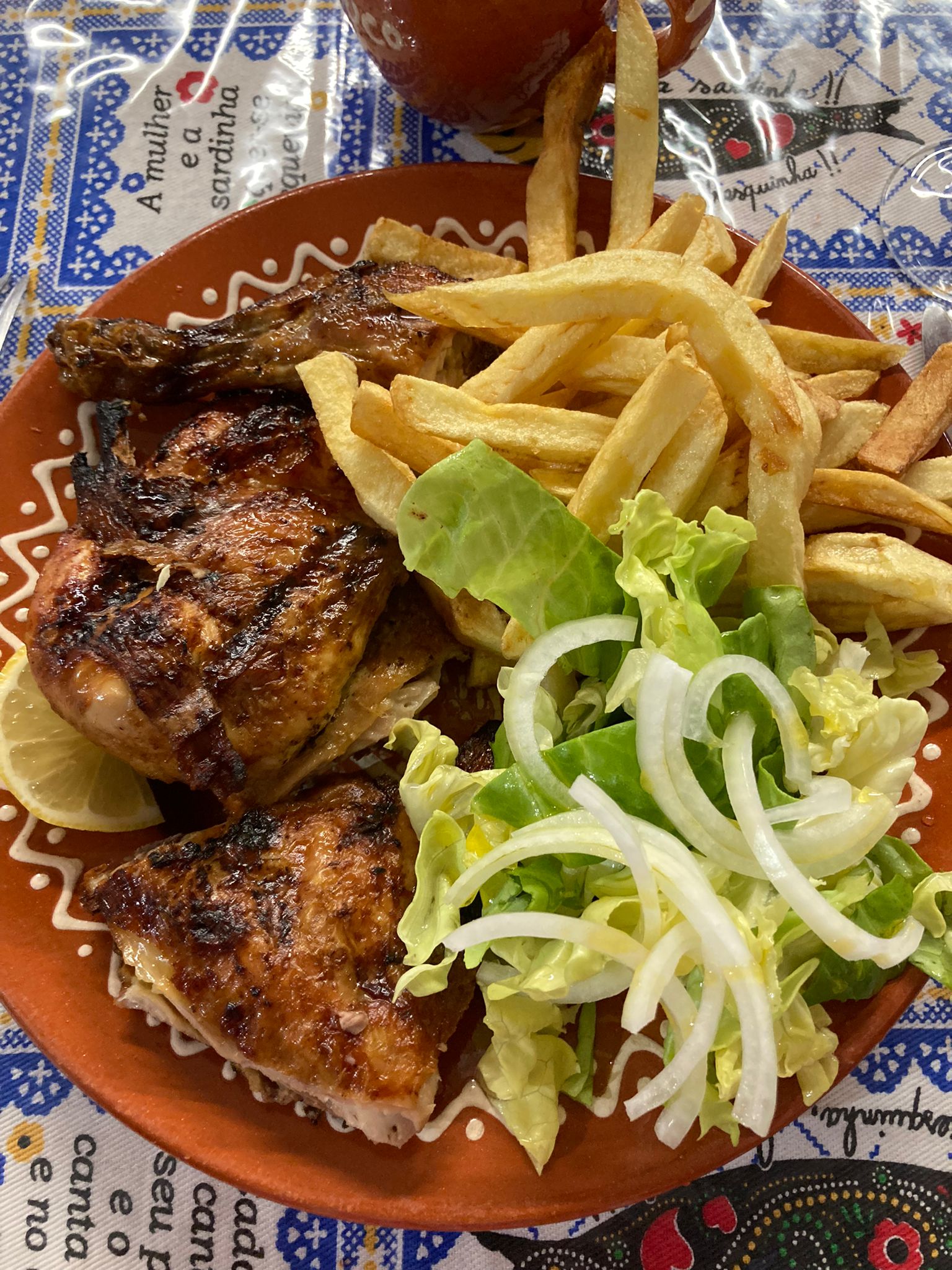 Accueil et cuisinière sympathique et souriantes, j’ai pris 2 poulets churrasco et frites maison pour 4 , un vrai régal , Ils nous en a resté pour le soir , avec cette très jolie décoration on se croirait au Portugal, merci, à bientôt .