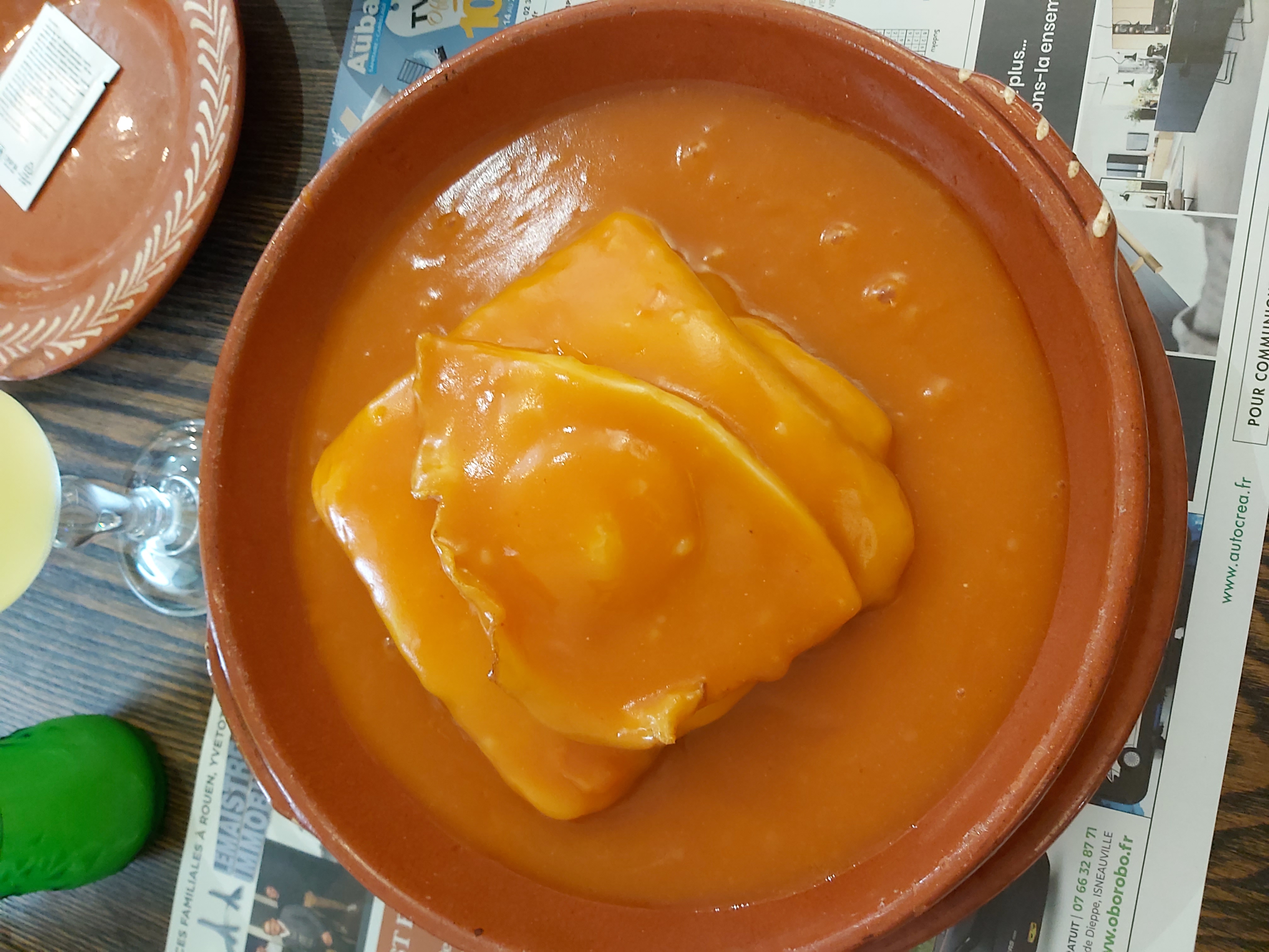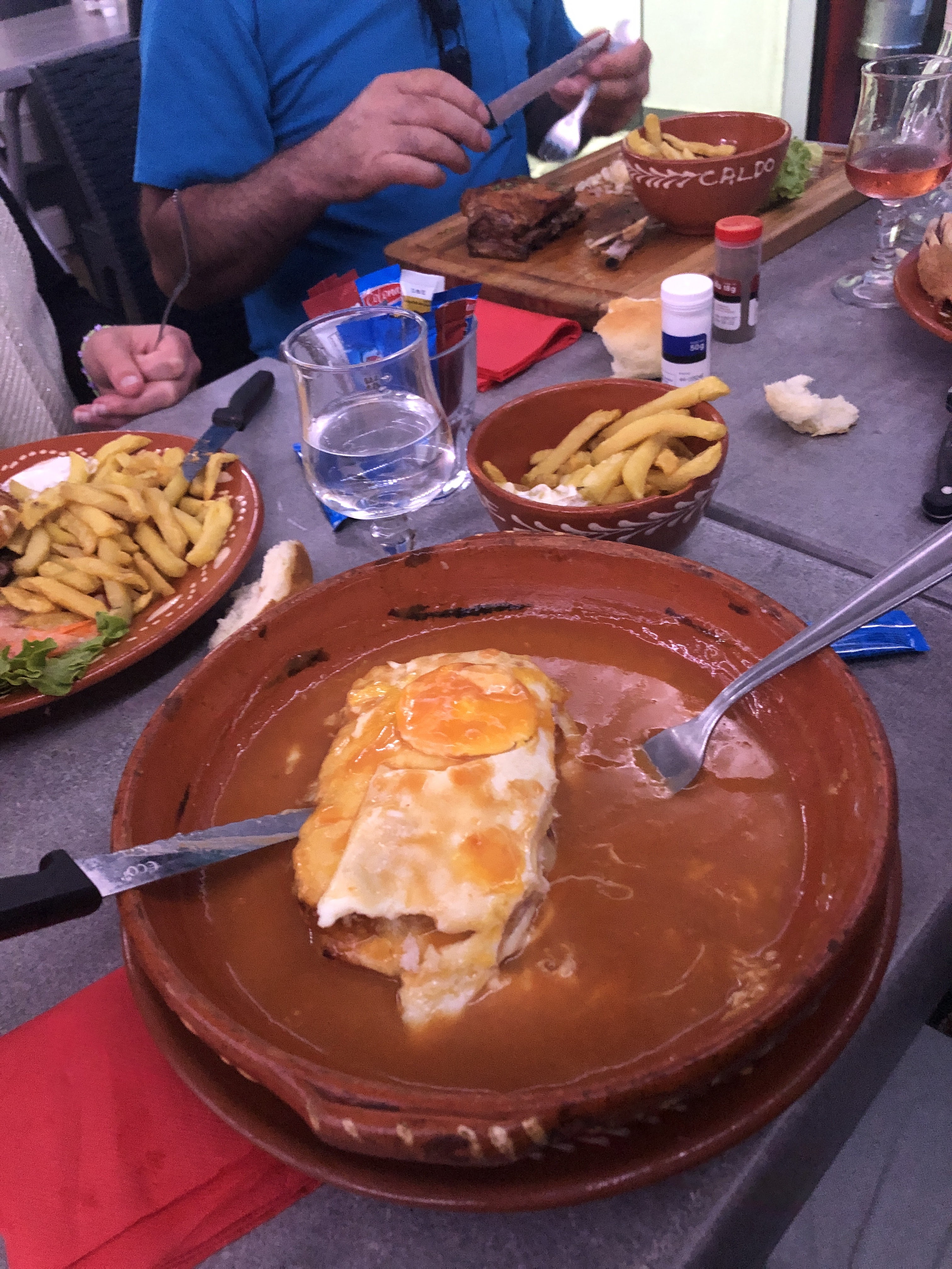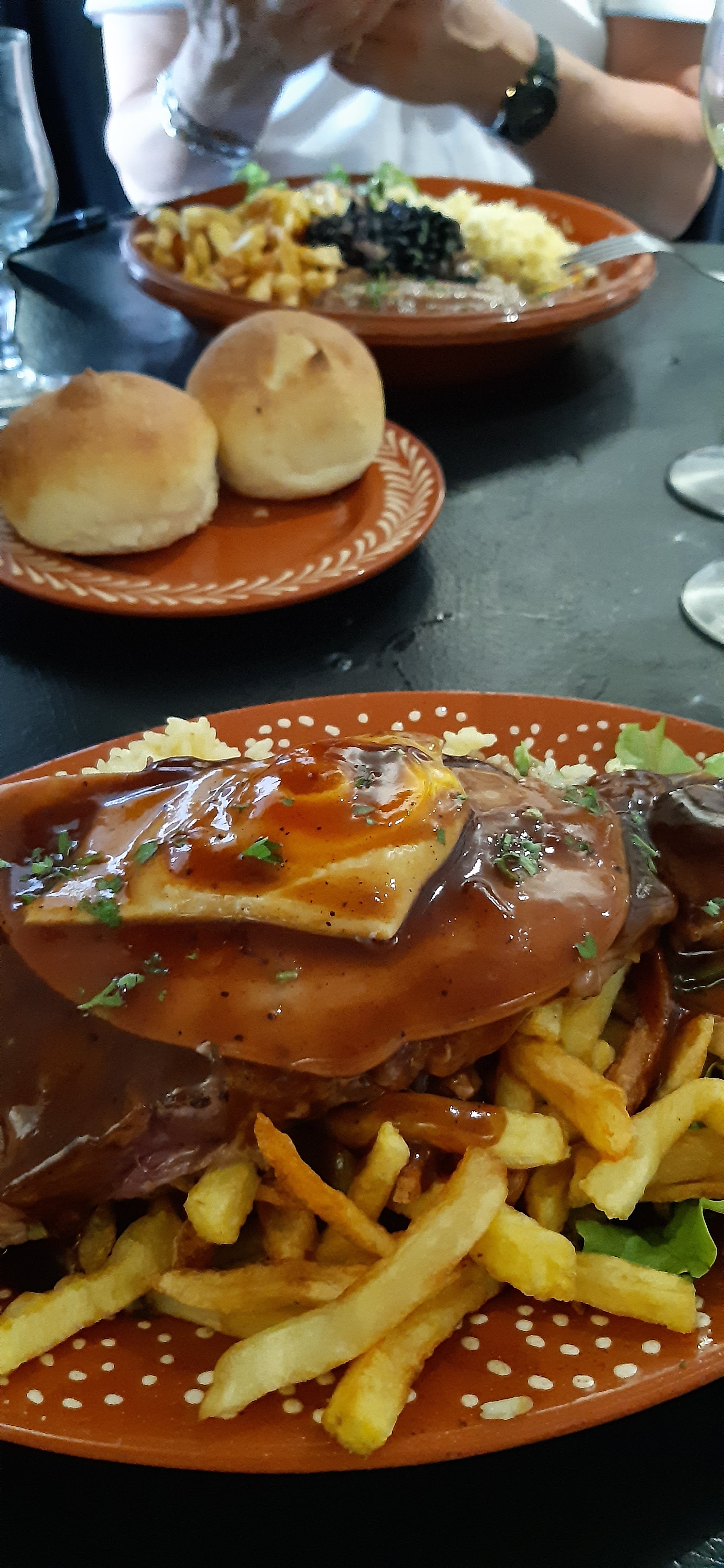 1ère francesinha...et terriblement déçu. Jambon et chorizo 1er prix caoutchouteux, un steak dur comme de le semelle. Un ami a pris de la morue...pleine d'arêtes. Askip c'était bon avant...y a longtemps !