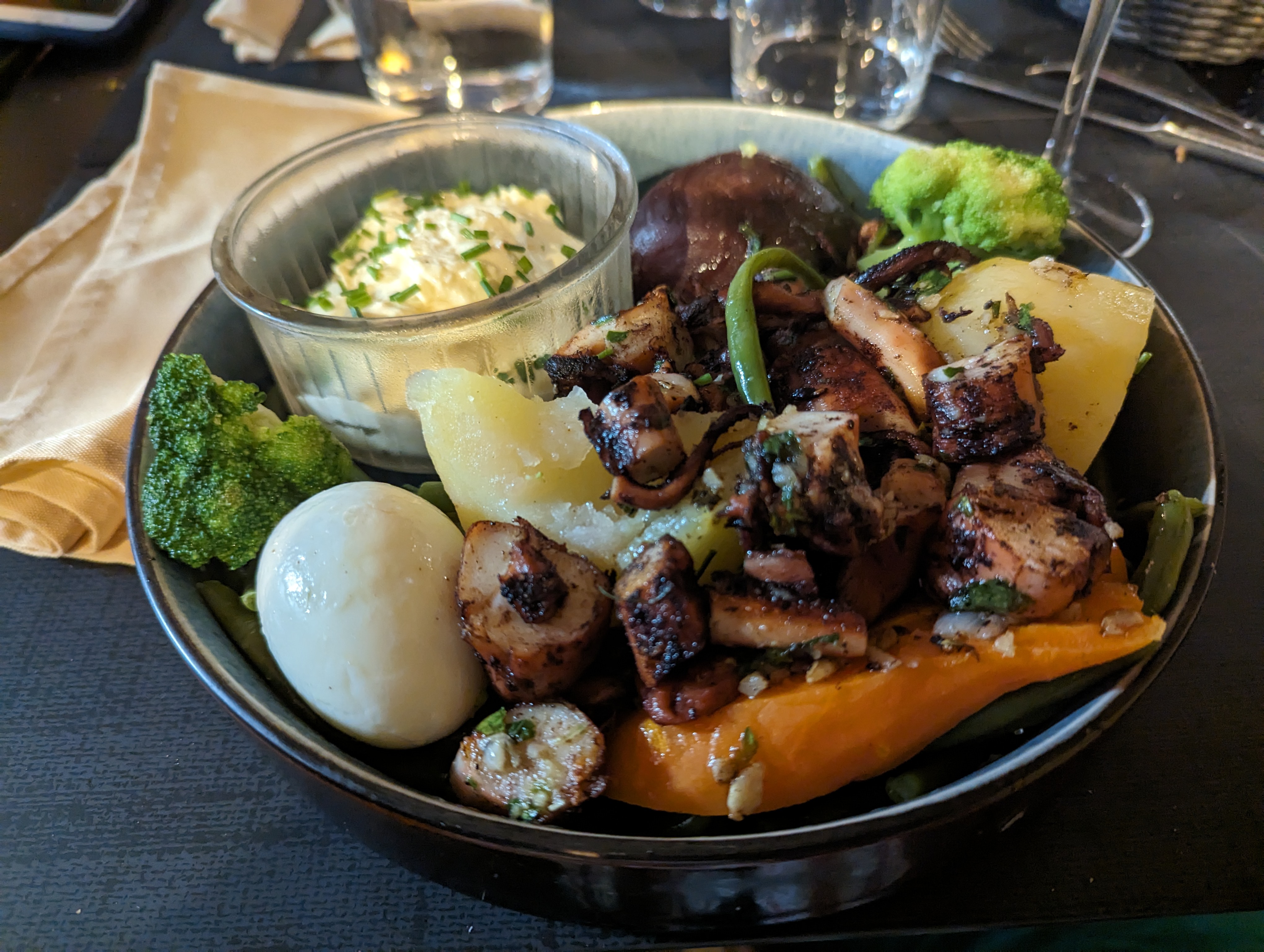 Légumes au top 👌🏻 par contre très très peu de poulpe (4 petites rondelles) dans l’aïoli de poulpe et un aïoli sans goût, sans ail … presque une mayo avec de l’ail séché. Dos de cabillaud très bon mais peu d’accompagnements … On reste sur notre faim et c’est cher pour ce que c’est.