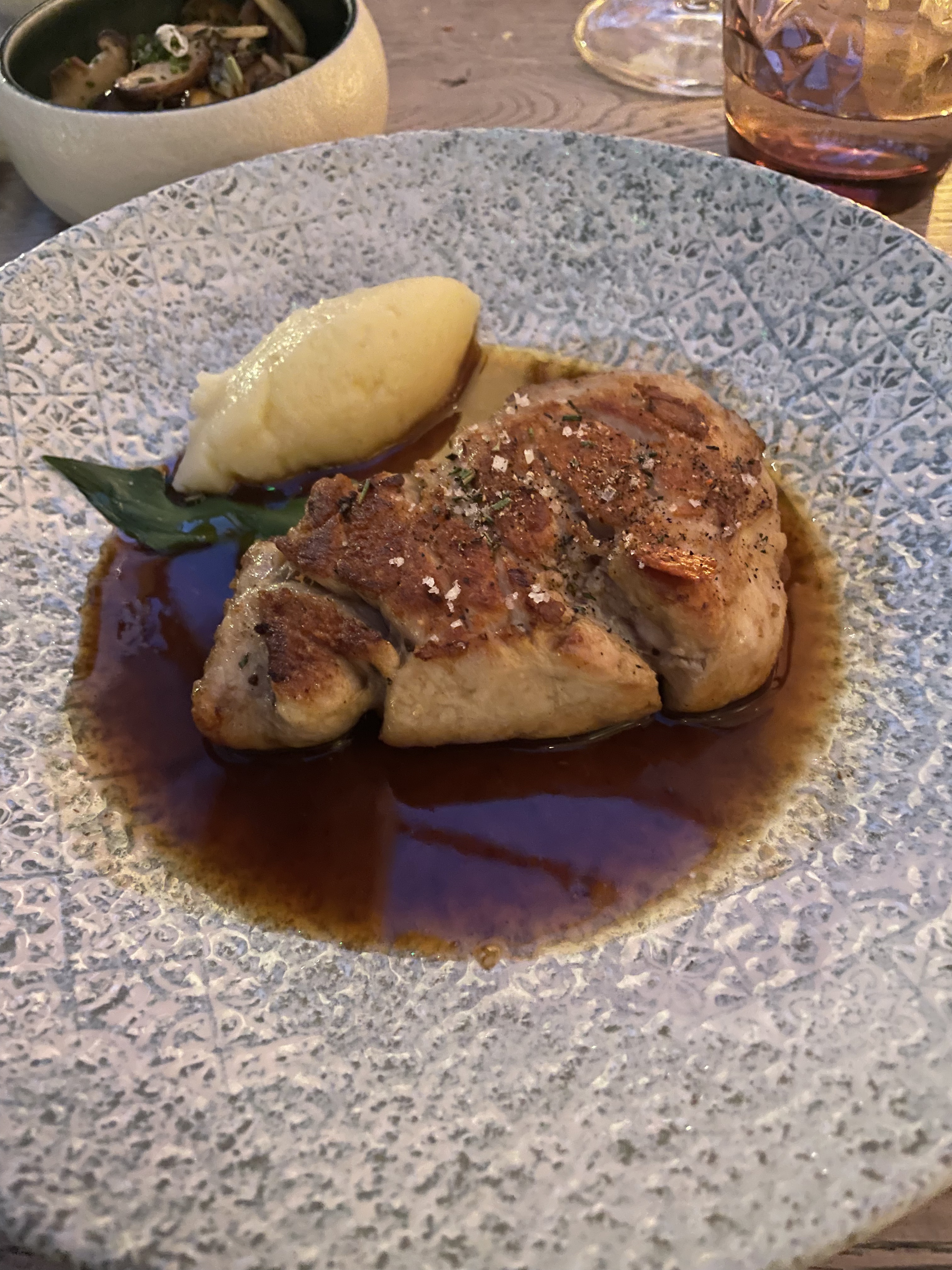 Chef bien connu mais on est venu par hasard un Lundi soir car seul resto ouvert. Cuisine ouverte vers la salle donc on peut voir le Chef et son sous-chef préparés les plats. On a pris la côte de bœuf pour 2 fumée aux foins (sous nos yeux) et découpée et servie à table. Pensez à réserver car même un Lundi le restaurant était rempli comme même. Le Chef vient voir les convives pour demander si tout allait bien. On n a pas osé la photo avec lui.