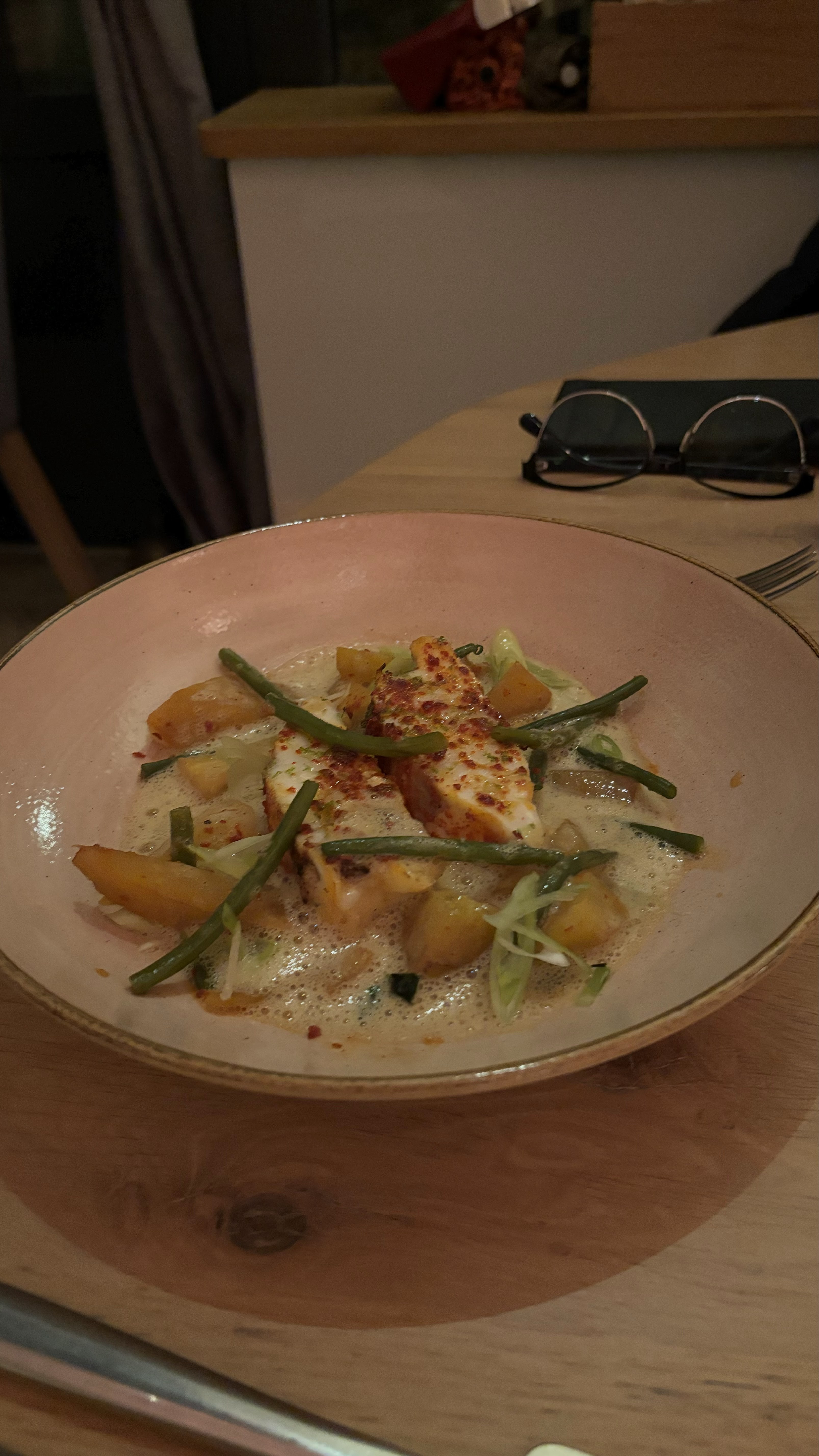 Un plat succulent (le poisson est très très bien cuisiné et excellent) mais le dessert manque de subtilité. Le vin est très cher et l'addition globale élevée. Pas de menu le soir alors que ceux du déjeuner sont très abordables et sont les seuls tarifs indiqués sur le site web, un peu en trompe-l'oeil. Il y a une différence trop importante, qui ne s'explique pas, entre déjeuner et dîner qui assombrit le souvenir que l'on gardera du restaurant. D'autant que le cadre (déco) est vraiment très sympa.