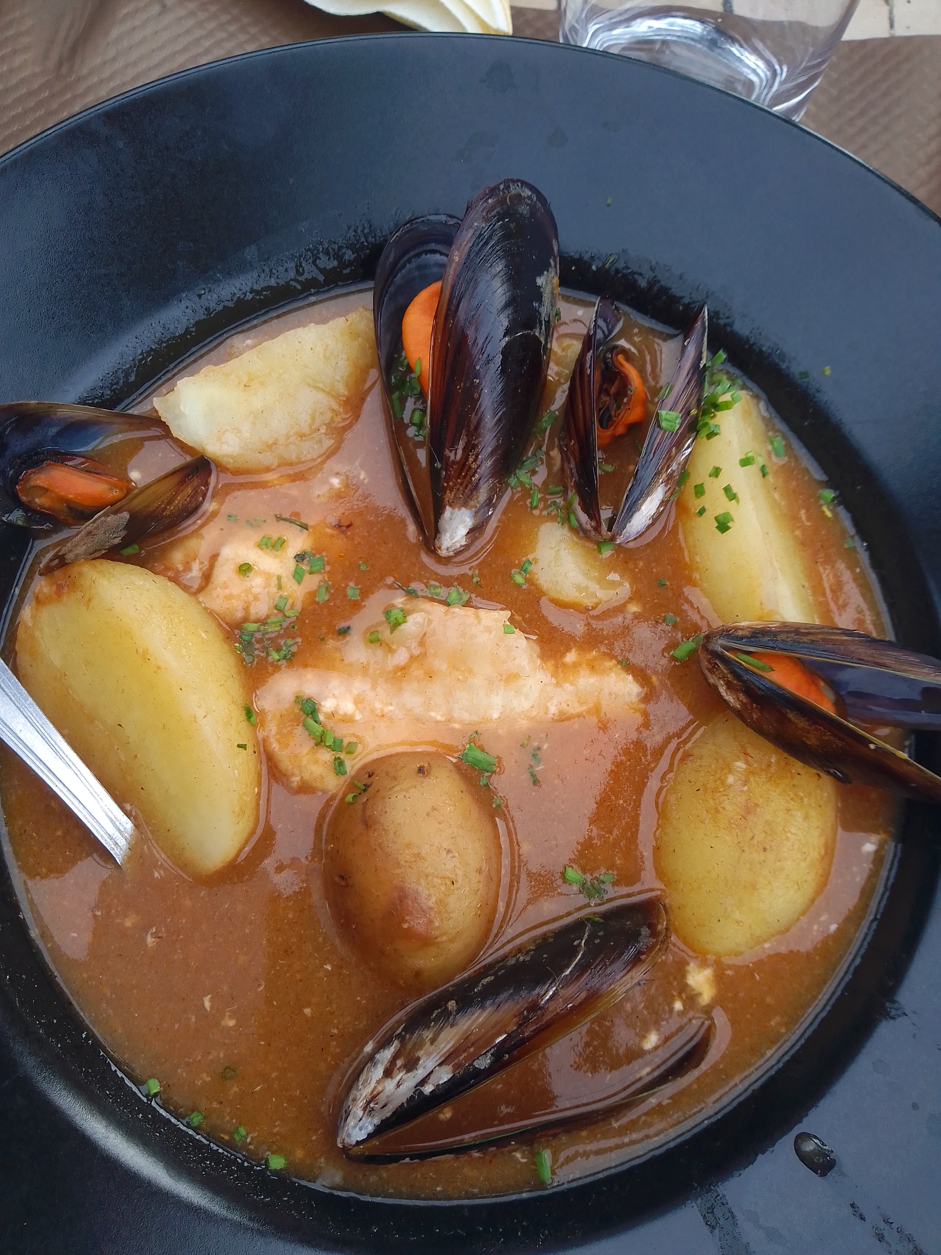 Moule sans goût même avec la sauce (roquefort et marinière) des frites qui etait plus des fonds de paquets c était bof