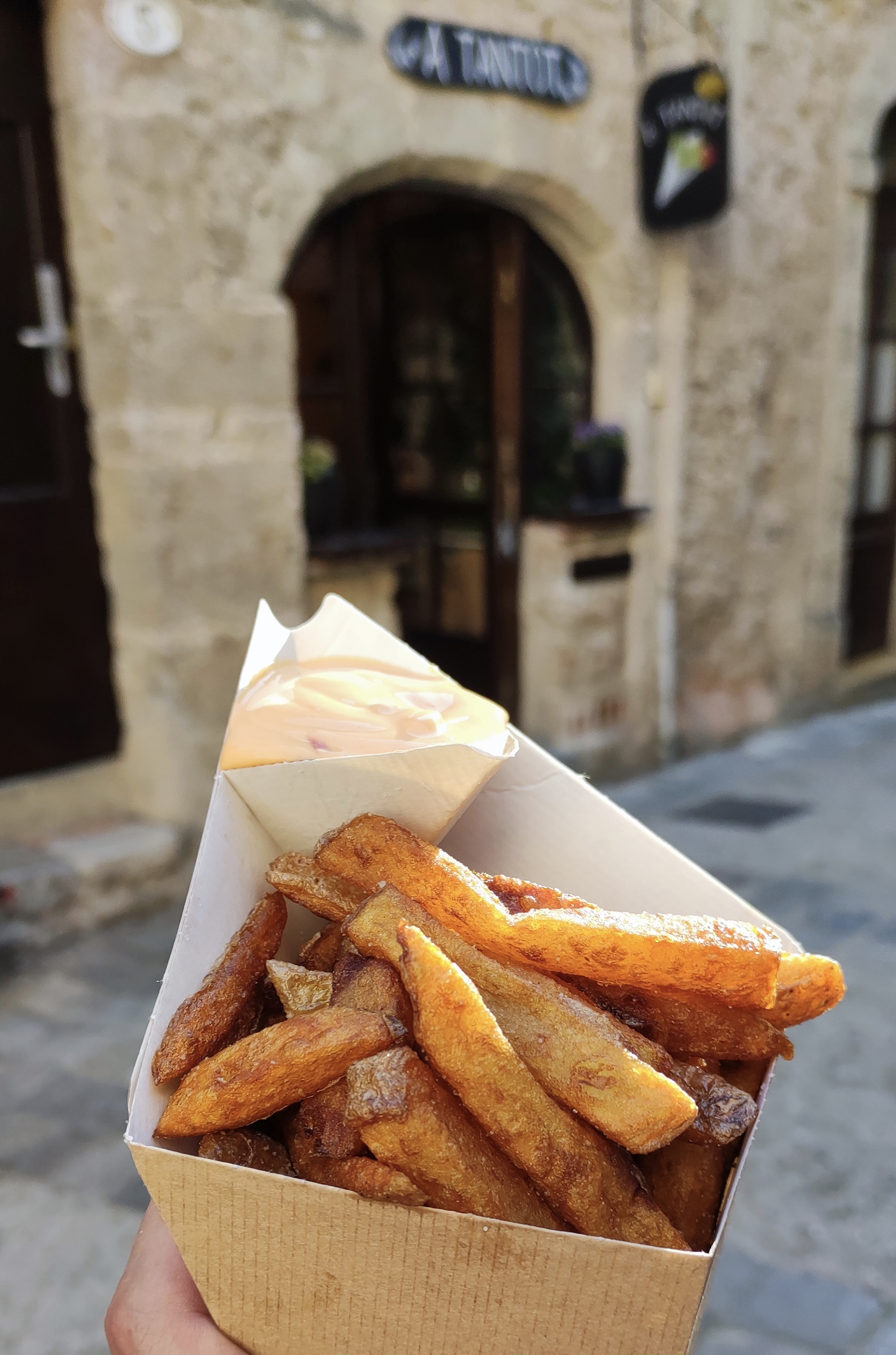 Les meilleures frites qu'on ait mangées, cuites à la graisse de boeuf comme il se doit, servies en 10mn (tout est fait à la demande) par la propriétaire souriante et tres sympathique Mangées sur la place centrale, à l'ombre. Quelques minutes croustillantes qui resteront un super souvenir de vacances