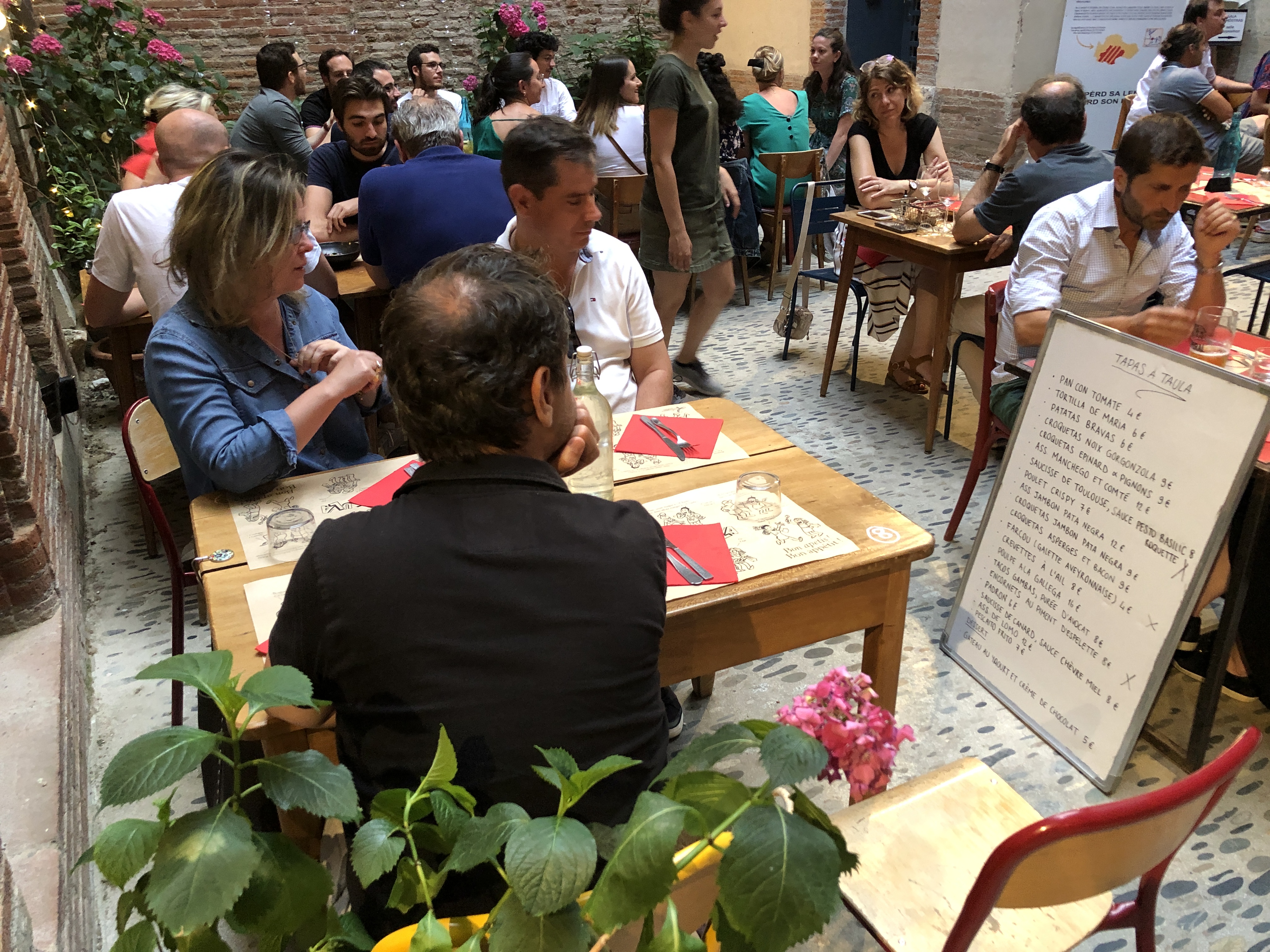 Endroit découvert au détour d'une balade dans Toulouse, on a réservé pour y manger le soir. Établissement se trouve dans une superbe cour intérieure d'un ancien hôtel particulier toulousain. Les tapas servis le soir sont tout aussi bon que l'endroit est beau. Pas bcp de choix mais c'est gage de qualité. Endroit convivial on y passe une très agréable soirée. Pour les amoureux de la rapidité passaient votre chemin, l'endroit de toute manière ne s'y prête pas. Nous étions 8 dont deux enfants tarif abordable et nous avons fait la moitié de la carte. Les enfants ne sont pas obligés de rester à table, c'est une cour fermée... Les parents peuvent profiter. Le service est un peu tête en l'aire mais très sympathique. Je recommande.
