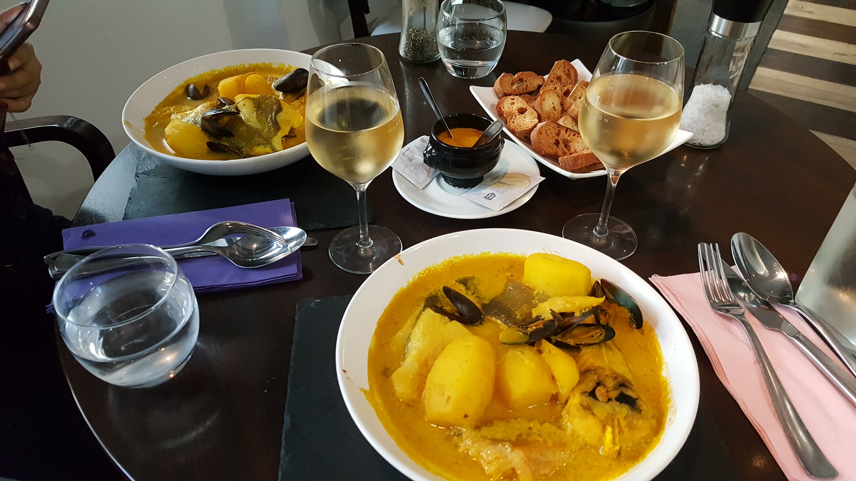 Les cannellonis aux fruits de mer étaient bons mais la bouillabaisse était franchement trop chère (40 €) et médiocre. J'ai vu comment ils passaient les fruits de mer au micro-ondes avant de les servir et on nous a servi une boîte de vin blanc. Donc si vous souhaitez manger de bons fruits de mer, ne commandez pas la Bouillabaisse et si vous ne précisez pas quel type de vin vous voulez, ils vous donnent une boîte de vin.