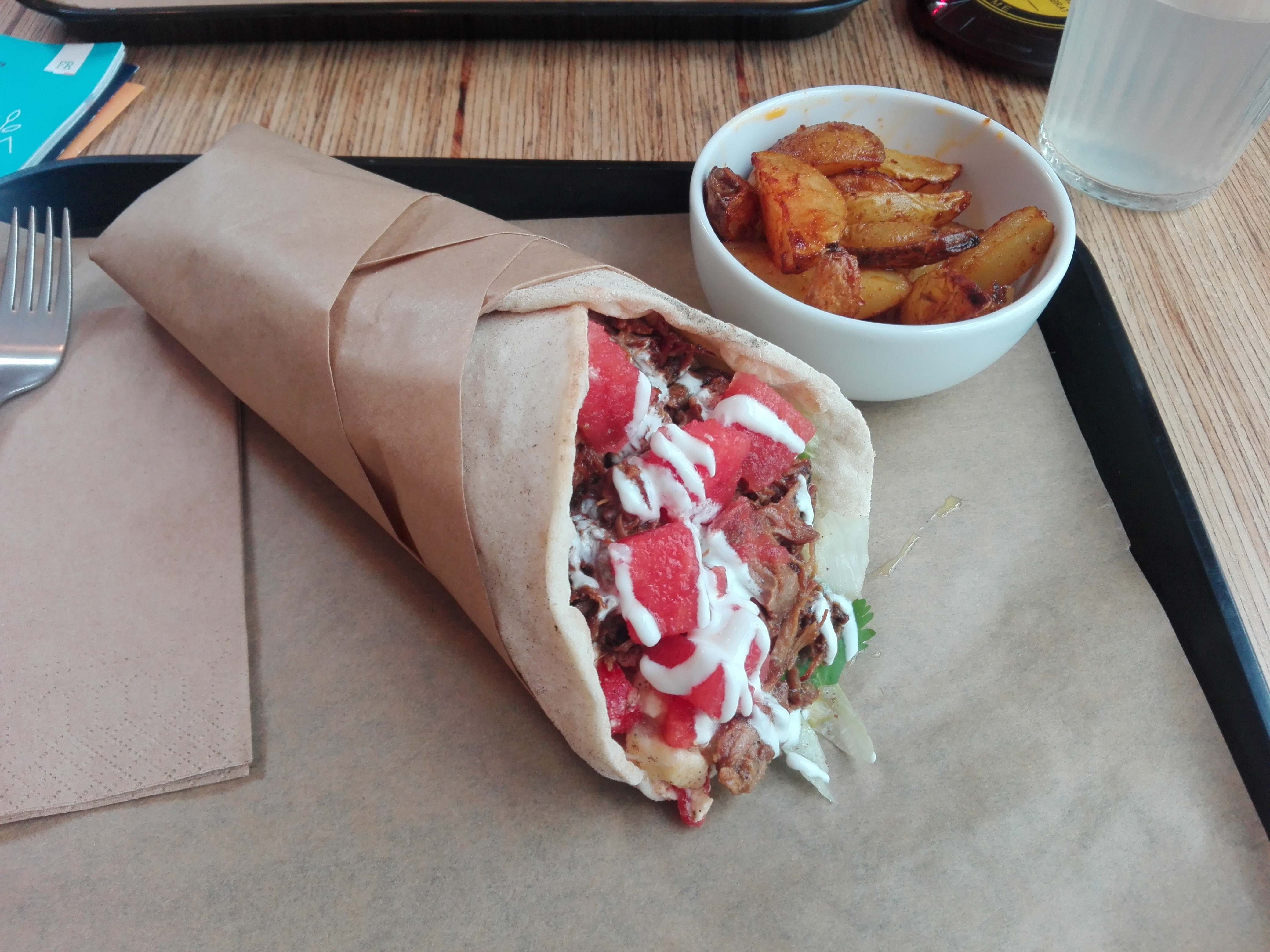 Très bonne pita à l'agneau accompagné de féta et pastèque. Il est cependant dommage qu'il faille attendre 30 minutes pour être servi, je suppose qu'ils sont victimes de leur succès et ont du mal à suivre le rythme. Certains clients qui sont arrivés peu avant 14h ont du faire demi tour car il n'y avait plus de viande de dispo...