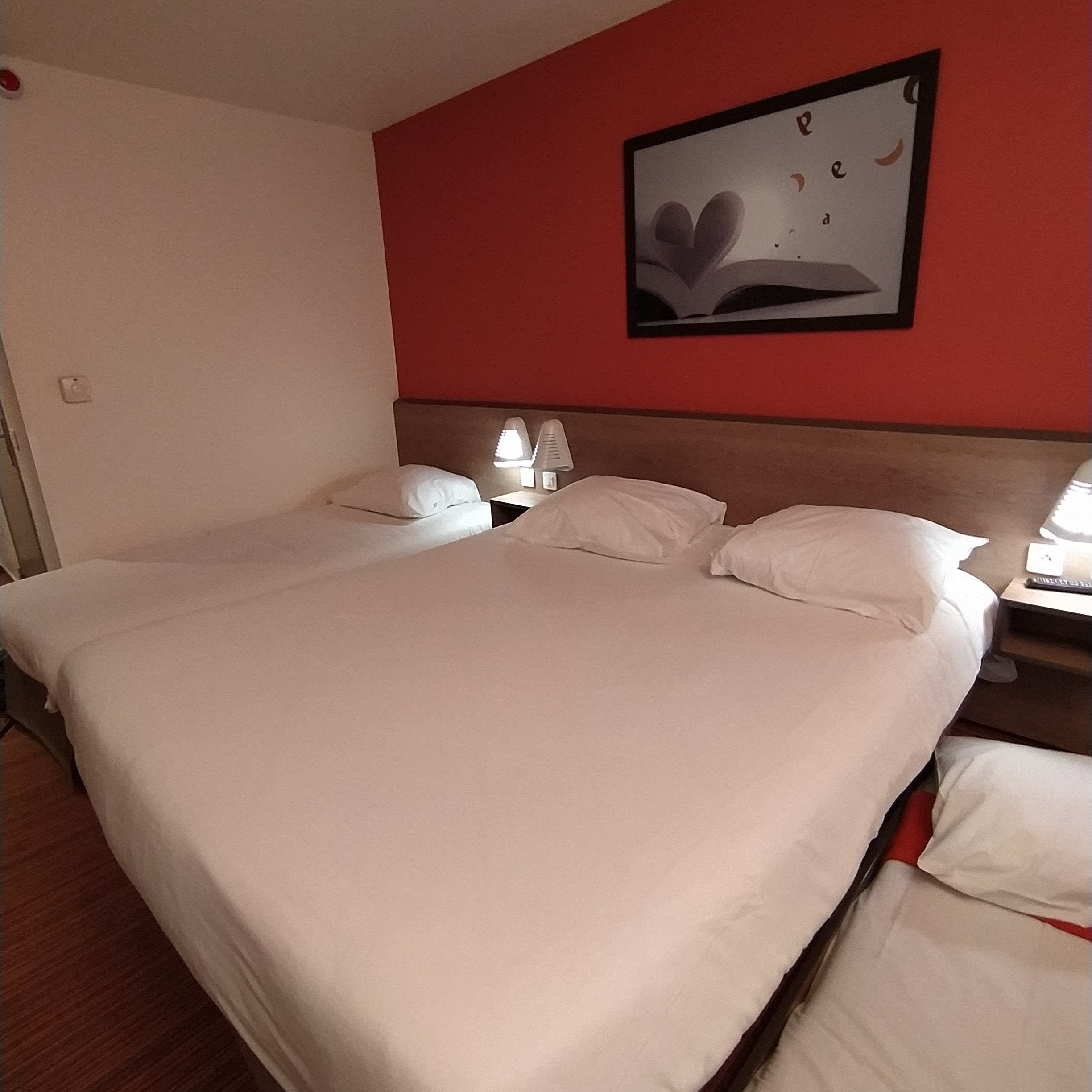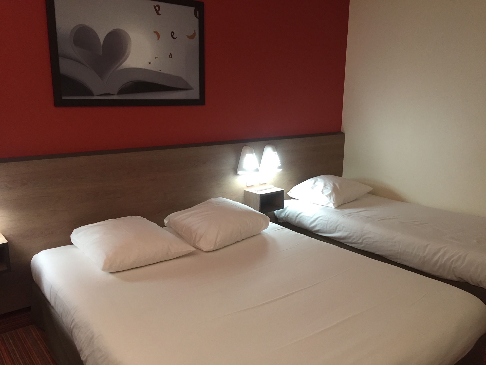 Arrivés à l’hôtel, l’ascenseur étant en panne, nous avons été obligés de monter nos valises jusqu’au 3ème étage ! Une fois dans la chambre quadruple, nous ne voyons pas le 4ème lit. Il n’était absolument pas visible, et pour cause, placé plus bas que le troisième lit et il était trop court pour mon fils qui mesure à peu près 163cm, ce qui fait qu’il a passé sa nuit les pieds hors du lit et à se cogner les genoux dans les chaises. Détail qui n’était indiqué ni lors de la réservation ni sur les photos ! Heureusement, le petit déjeuner était bien (même s’il n'y avait plus de jus d’orange) et l’emplacement nous convenait. Le personnel était sympathique.