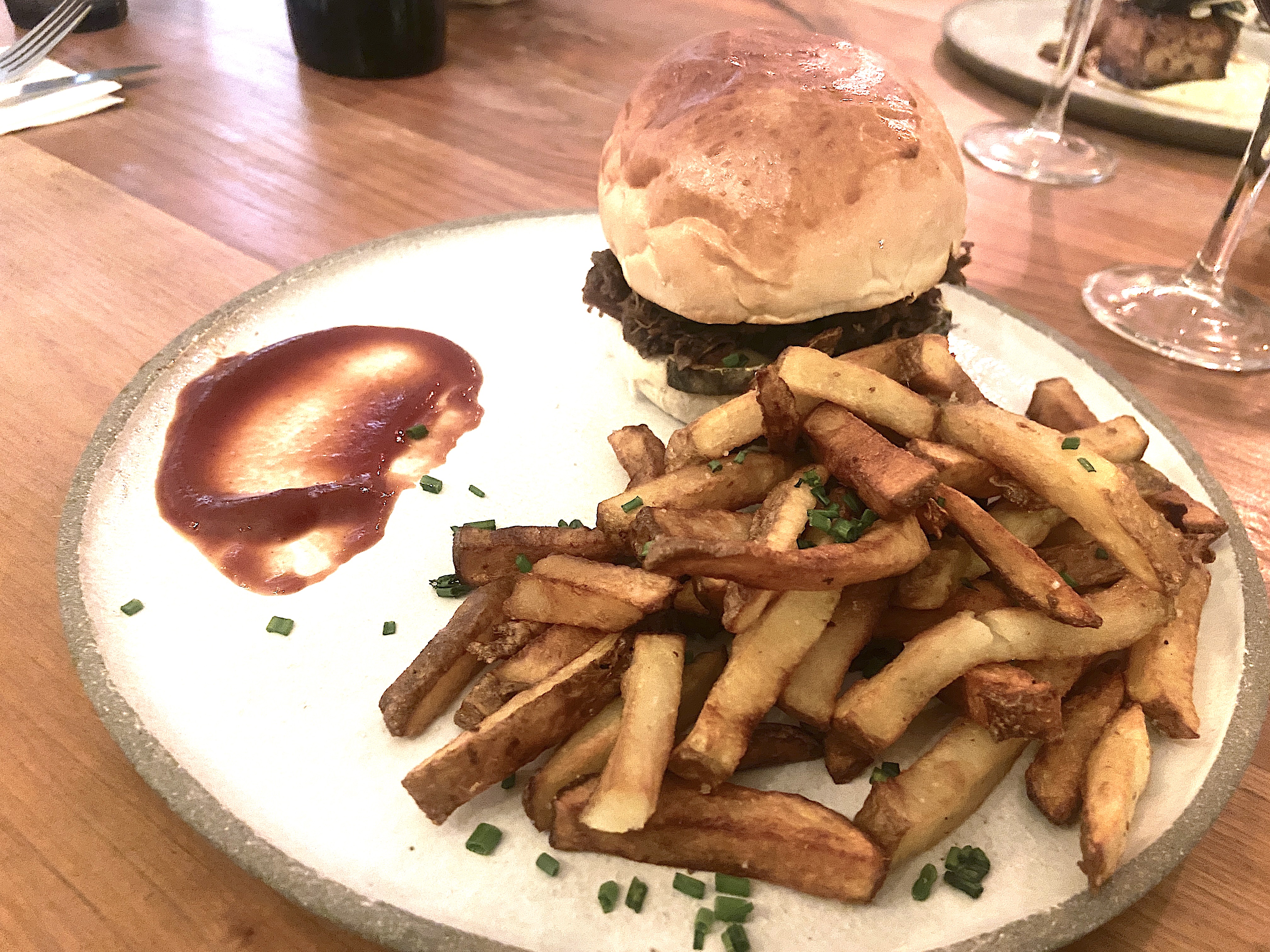 Un restaurant avec une ambiance agréable. La salle est plutôt calme, la décoration est sympathique et la lumière tamisée le soir apporte un certain confort pour le repas. Pour ce qui est de la cuisine, on sent qu'il y a de l'idée quand on regarde. Les mélanges et associations sont plutôt audacieuses. Cependant, et malheureusement, c'est fade. Mon palais s'est ennuyé. J'ai commandé le burger à l'effiloché de boeuf, Saint-Nectaire et moutarde à l'ancienne, et séparément les produits sont bons, mais ensemble, il n'y a rien qui ressort, aucune saveur qui se démarque. Mention spéciale aux frites et à la carte des boissons. Pour faire court, c'est cher pour ce que c'est.