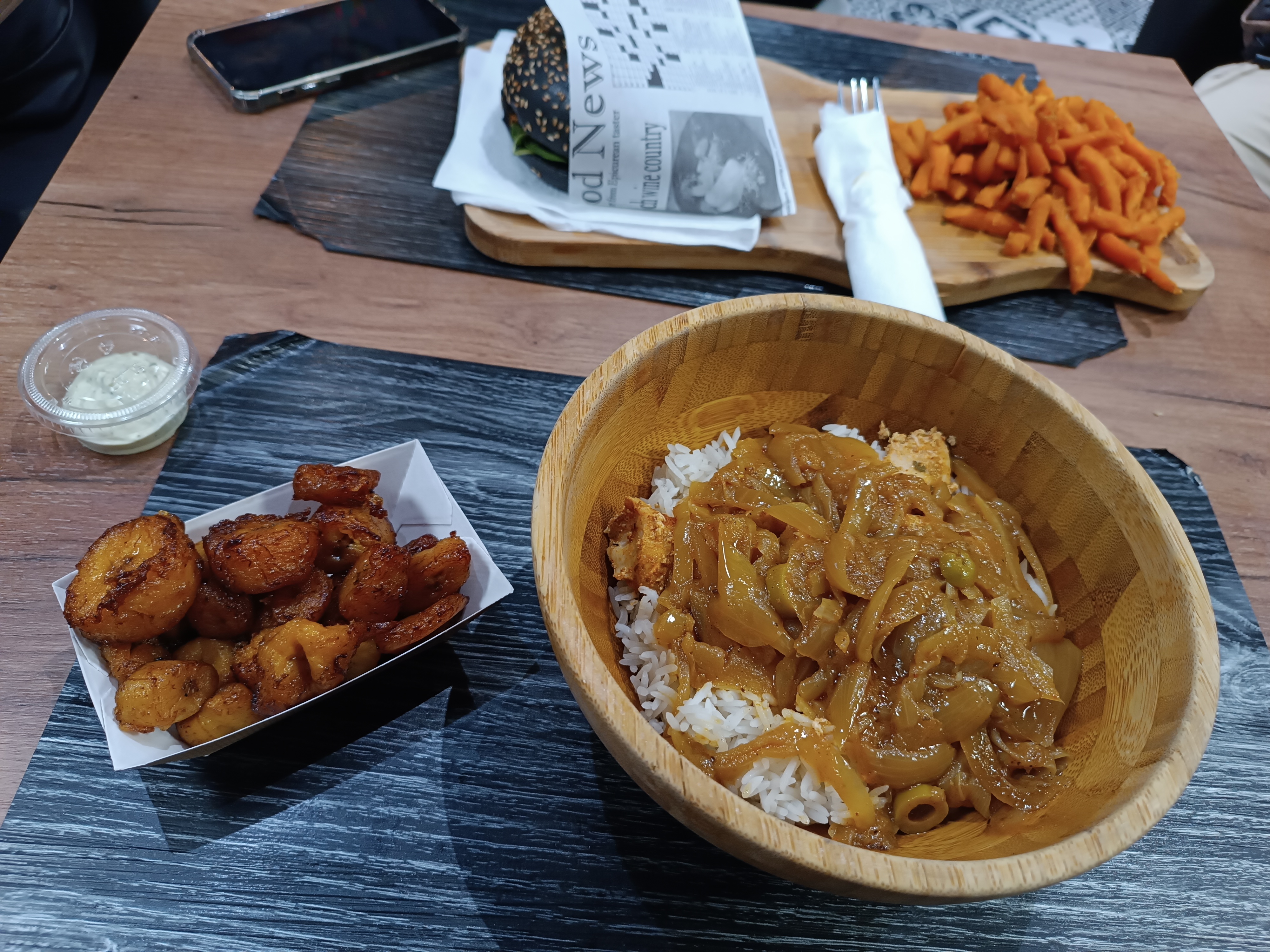 Le burger au poulet, les frites de patates douce et la sauce verte un tuerie !! Parcontre un mini bout de carottes pour un plat de mafé c’est dommage..et la dame à la caisse pas très professionnel