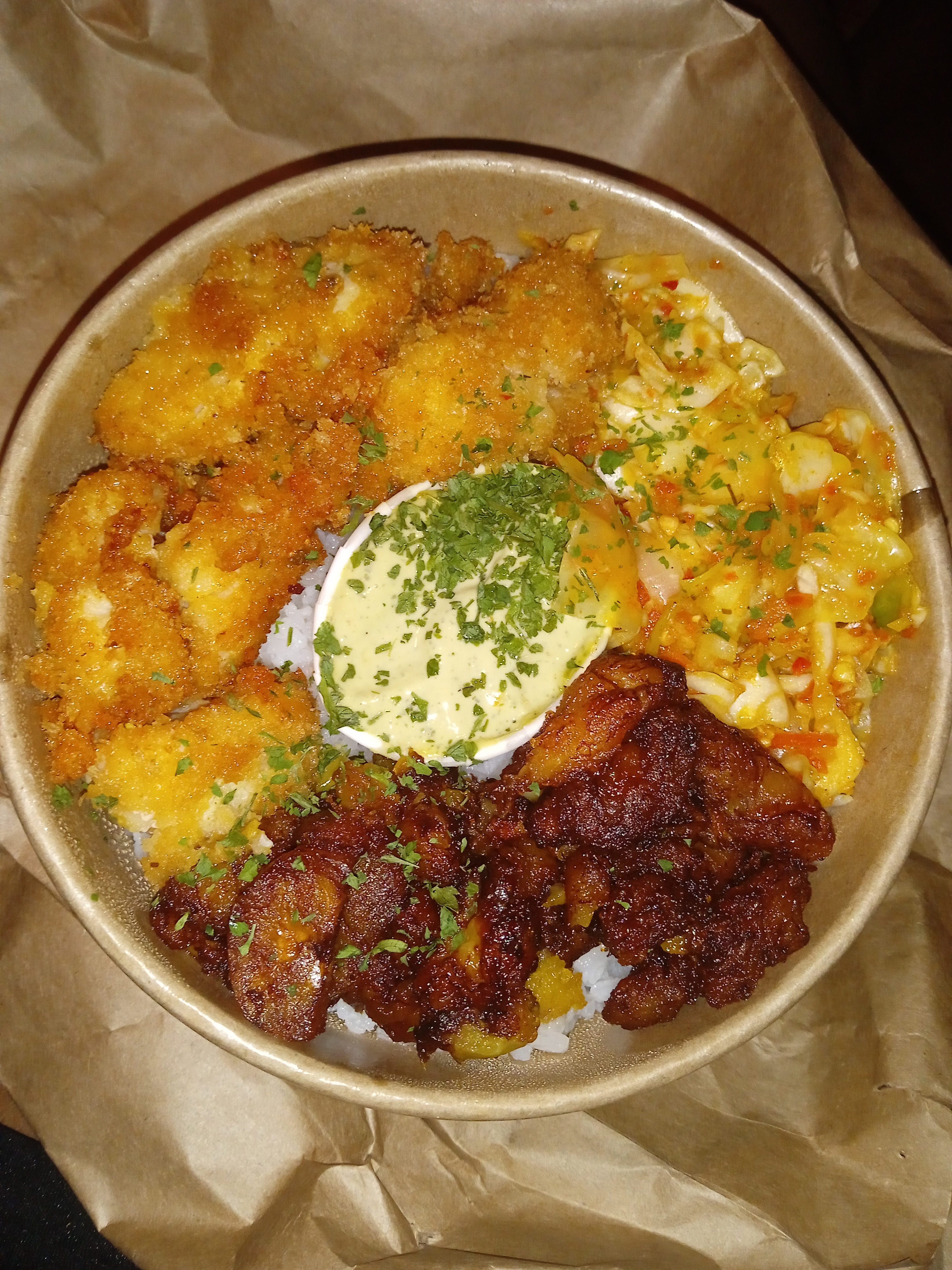 Franchement je recommande cetais excellent . J'ai pris une BOWL poulet avec des suplements crevettes et poulet . C'etais une tuerie . Le riz bien cuit la viande au top . Les crevettes frits super grosses moi qui adore ça je n'avais rien a redire . Le restaurant étant en travaux nous avons pris a emporter . La BOWL est bien garnie on l a manger a deux plus les suppléments comme cetais une première nous avions peur d'être déçu mais la prochaine c'est chacun son plat 🤪. Délicieux bravo au cuisto avec la petite sauce et la salade vraiment un régal