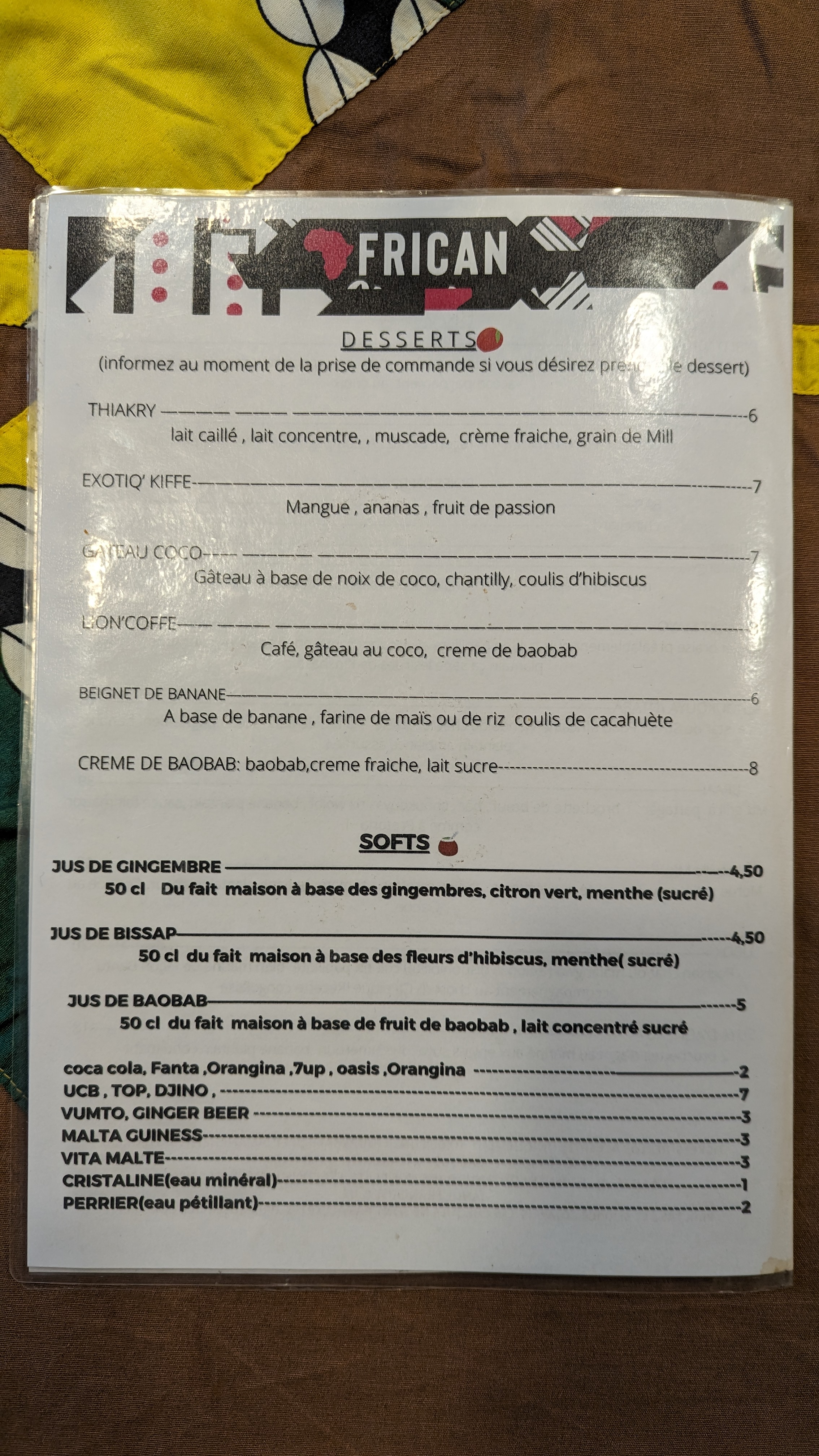 La carte du restaurant est plutôt étendue, ce qui est vraiment bien et fait découvrir différents plats d'Afrique. Les plats sont bons et le personnel sympa.