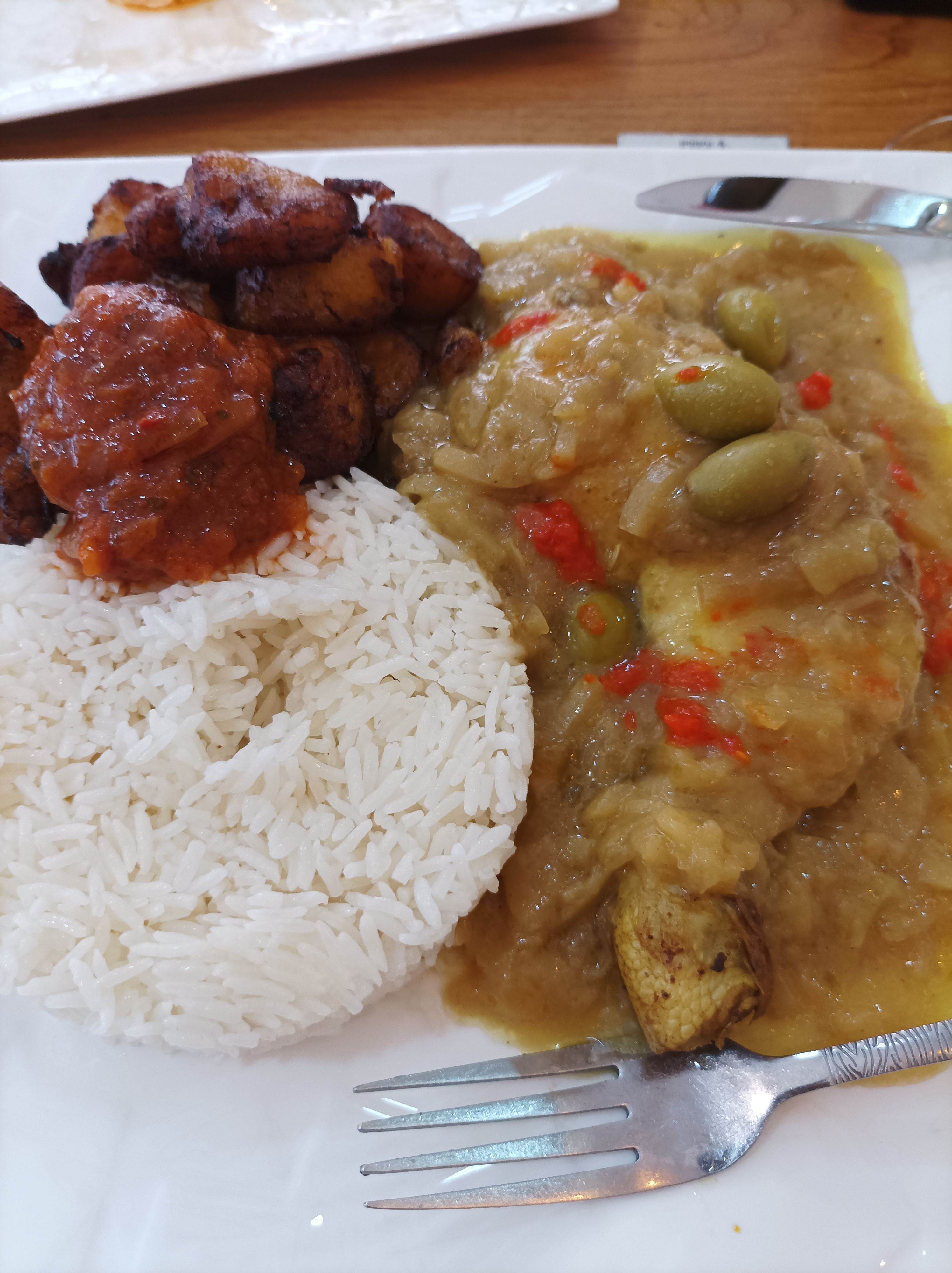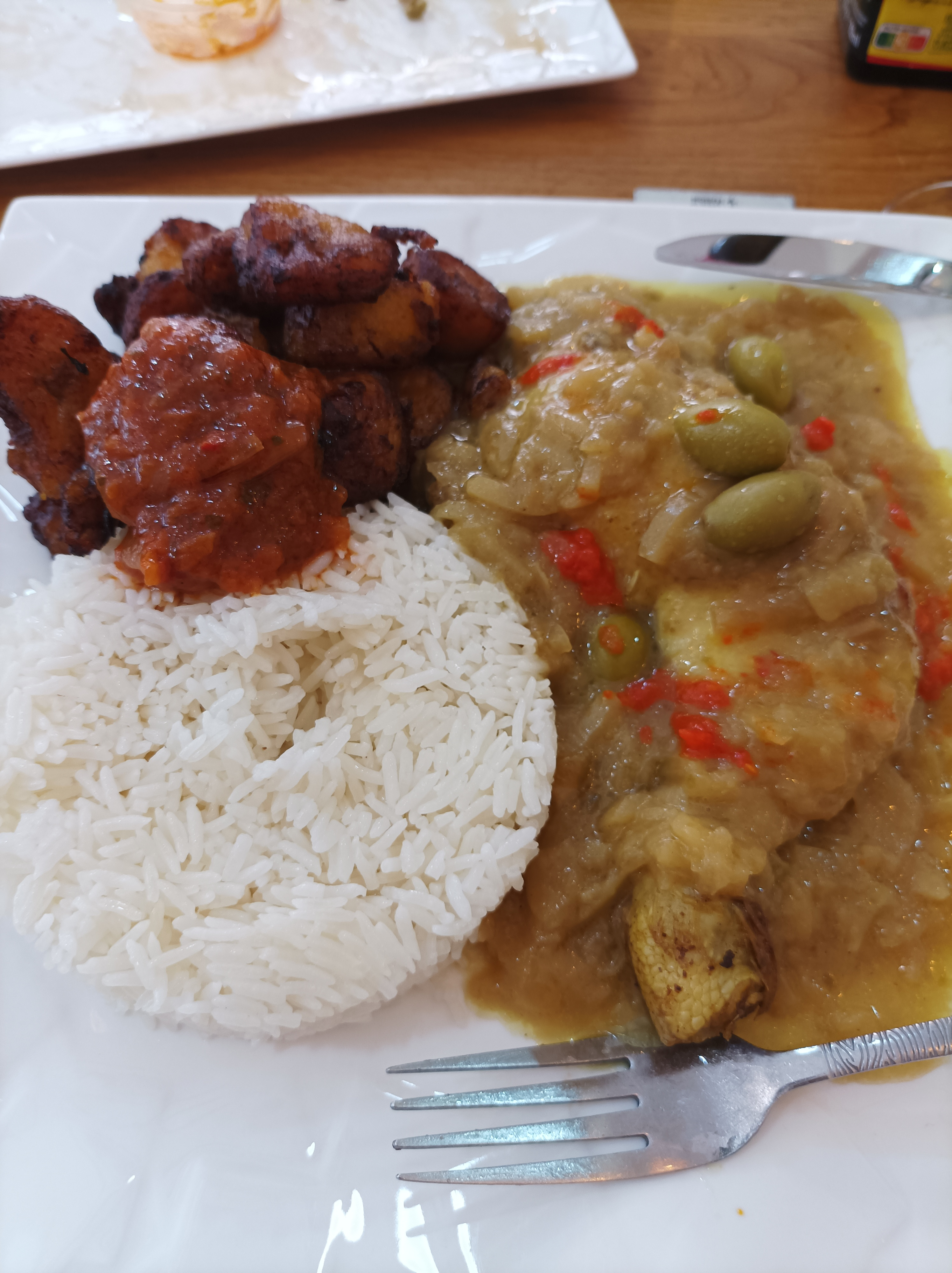 Déçue !! Ce n'est pas mauvais, ce n'est pas non plus le meilleur africain que j'ai mangé. L'aloko quand a lui n'est pas génial. Les frites, le riz et les sauces sont bons. Mais ce qui m'a le plus déçu c'est le service. J'ai demandé à la serveuse si dans ce plat c'était du blanc de poulet ou de le cuisse désossée (en précisant que je n'aime la cuisse de poulet) et elle m'a assuré que c'était du blanc, et au final ce n'est pas du blanc mais bien de la cuisse désossée