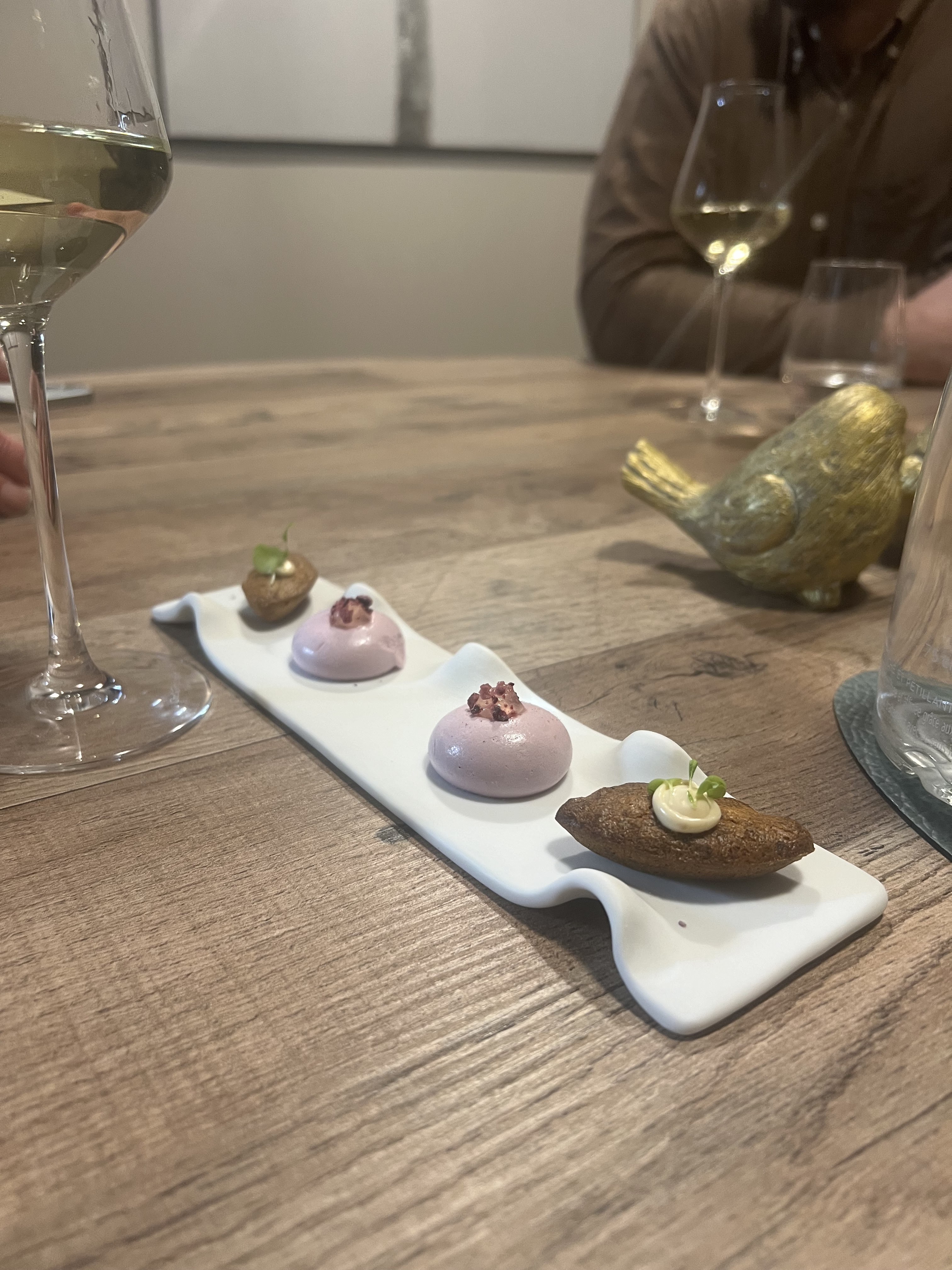 Un concept vraiment merveilleux et une expérience pas facile à trouver dans le coin, à part Darroze à Langon d'après mon expérience. C'est une cuisine raffinée, pas un bistro/brasserie. Des plats vraiment bien pensés et astucieux. Menu du midi E/P/D à 26 € ce qui est raisonnable pour ce type de restaurant. Nous avons apprécié toutes les parties du repas et nous reviendrons certainement. L'anglais est également parlé, si vous le souhaitez ! Je n'ai que des photos du dessert.