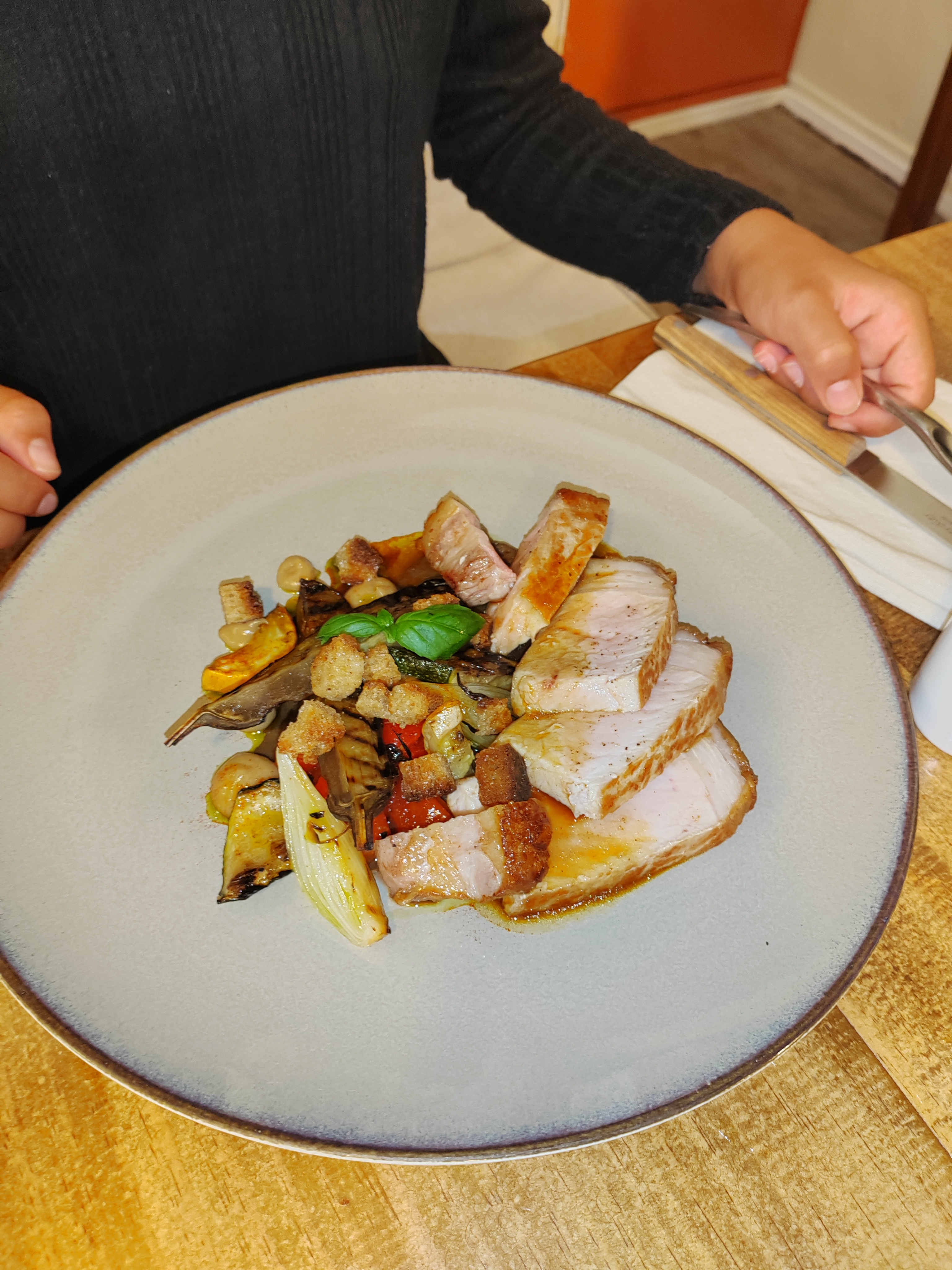 Déjeuner à 2. Nous avons beaucoup apprécié la saveur des plats : Salade de lentilles, œuf et lard paysan - Poitrine de cochon confite aux épices douces, semoule et carottes glacées - Agrumes et châtaigne comme une tarte meringuée. Le service était super agréable. Top.