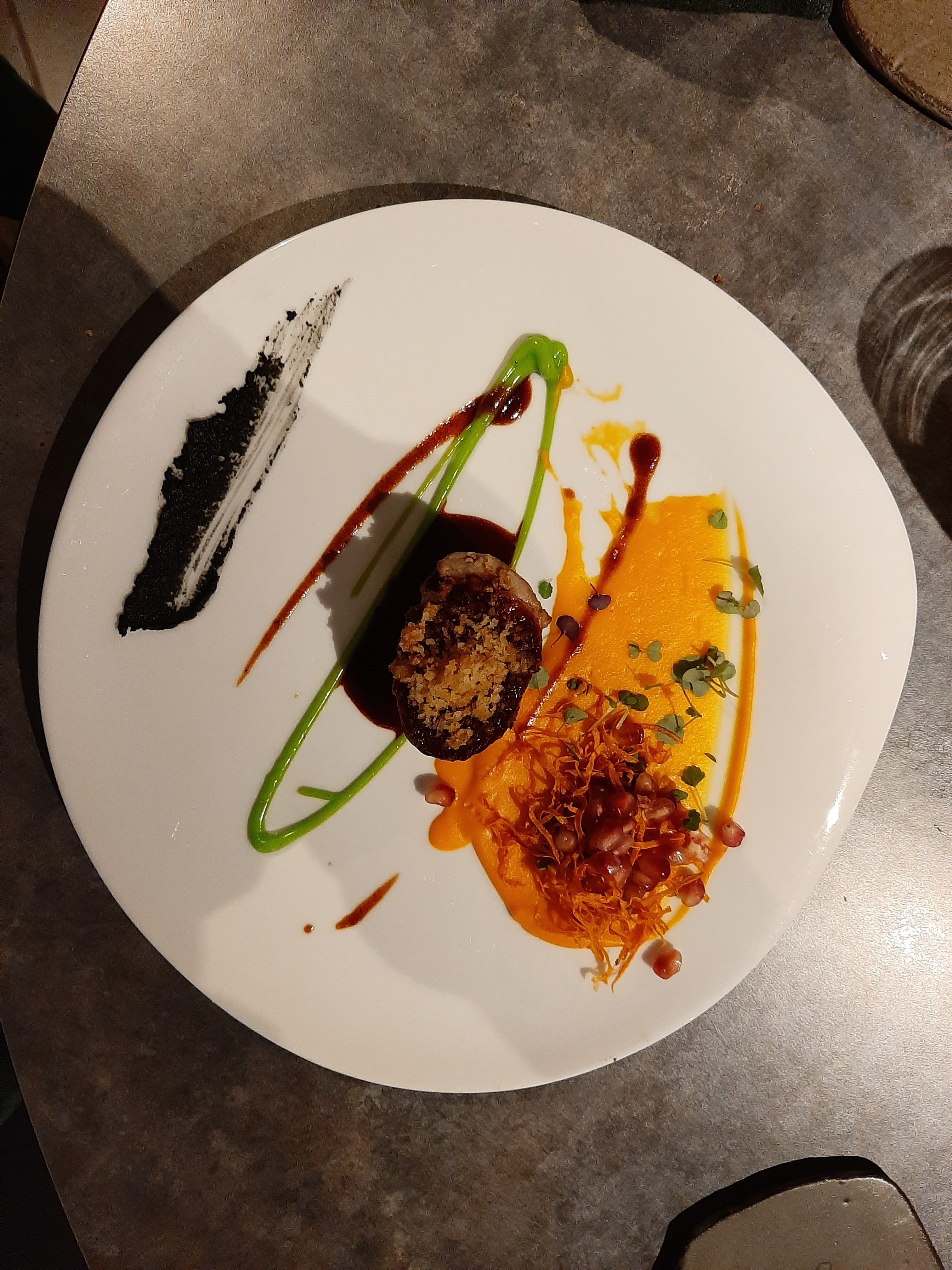 Très belle découverte 😁un vrai plaisir gustatif, olfactif visuel, dans un cadre agréable, sympathique, un accueil un service parfait une décoration (peinture) faite par le chef(également un grand talent) A refaire sans hésitation