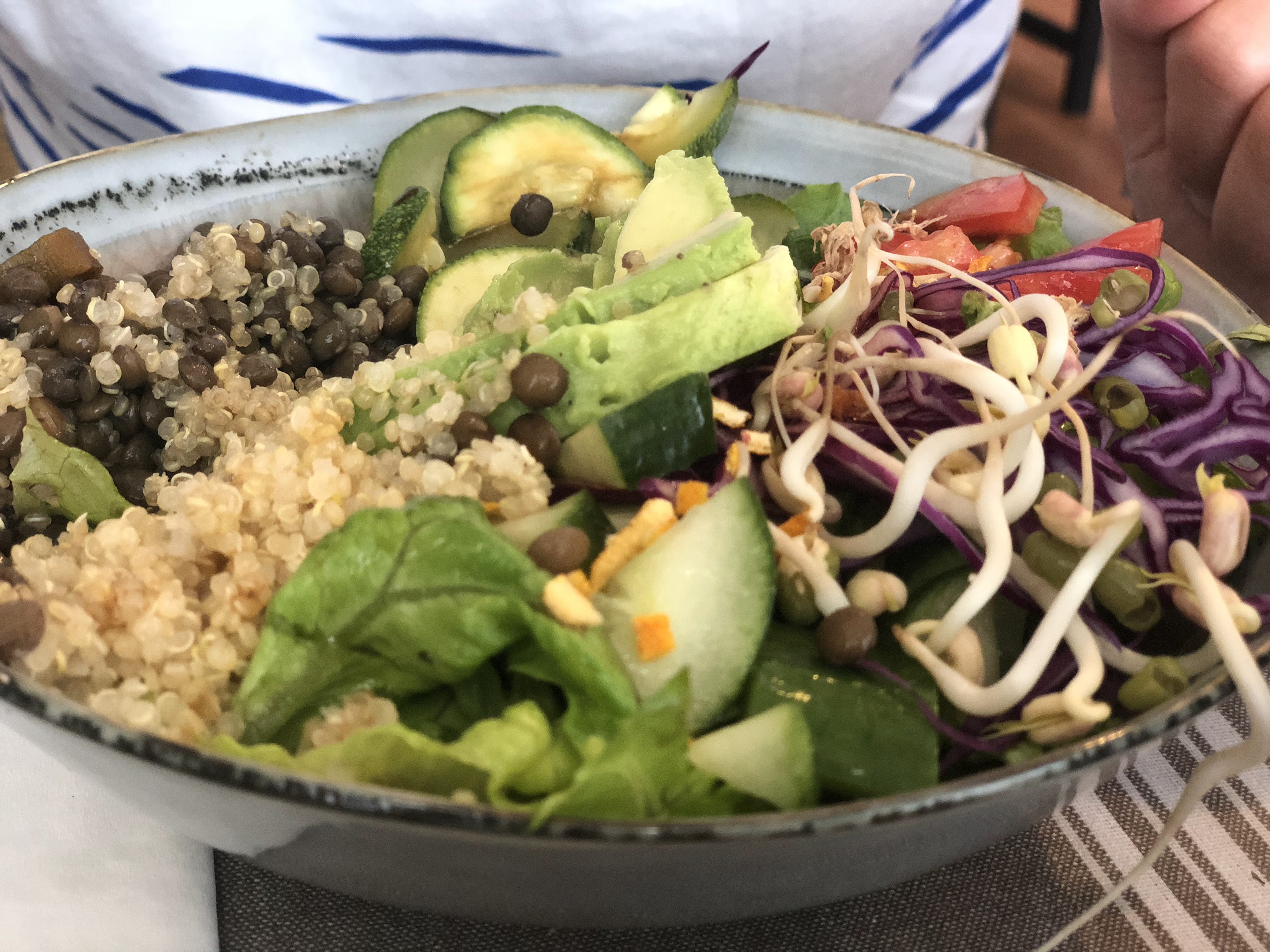Déjeuner végétarien 🤩. J'aime la viande, mais jadooore la cuisine végétarienne ! Des textures, des saveurs, des goûts... 😋 Découverte d'un resto veggie à concarneau avec Audrey ! 🥦🥬🌶️🥒🥕🍆🥑🥥🍓🍒 Mise en bouche : terrine de lentilles Entrée : soupe de légumes et flan aux algues, Plat : Buddha bowl, Dessert : panacota au lait de noix de cajou, fruits rouges.