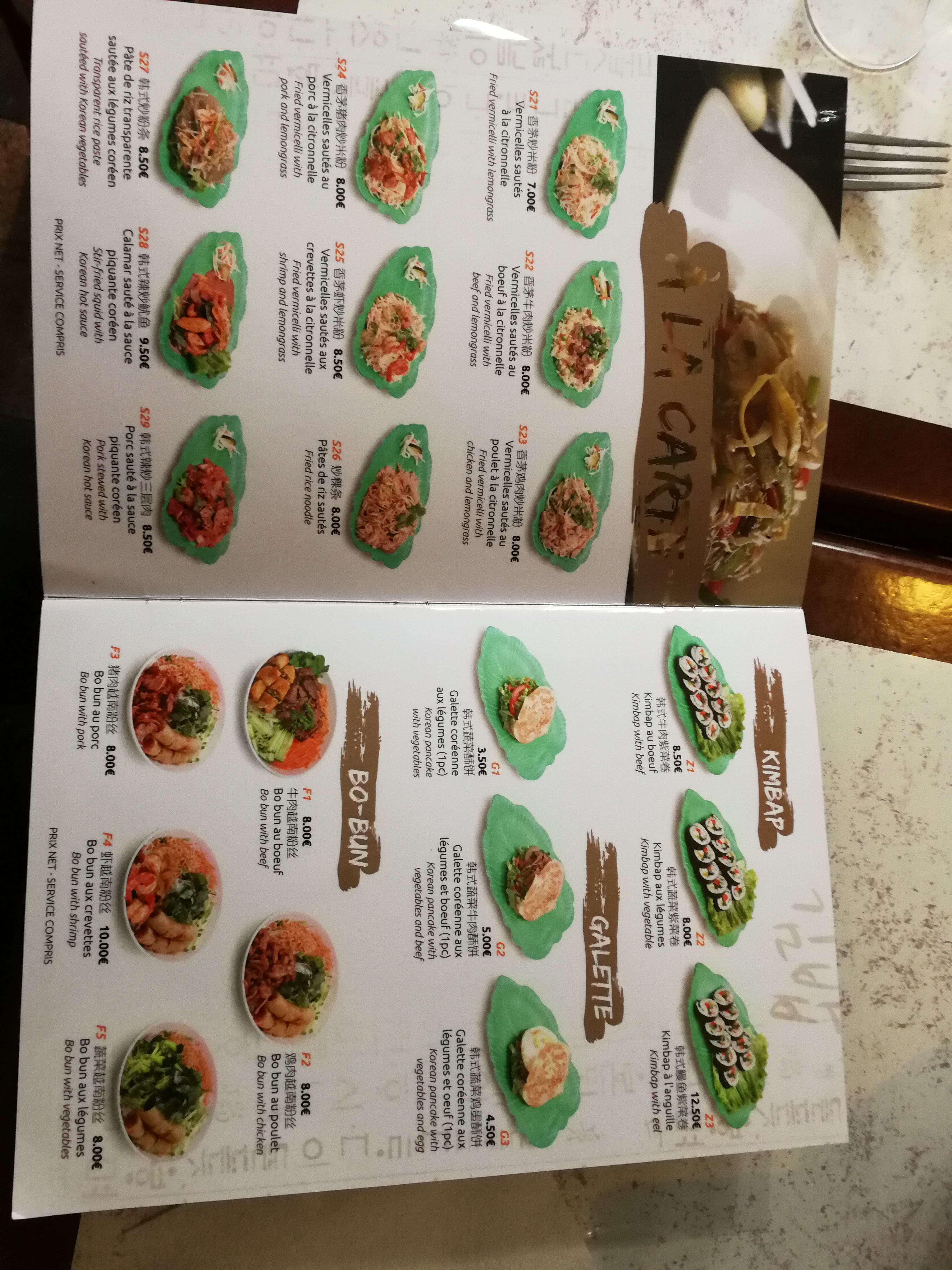 La carte est complète et bien présenté, ca donne envie de tout manger. Bon rapport qualité prix. Pour ma part j'ai pris un Bibimbaps poulet, simple mais délicieux. ATTENTION ⚠ le plat est chaud. Sauce piquante à disposition. Il est 16h00 et le restaurant est ouvert, de vrais pro! J'y reviendrai volontier.