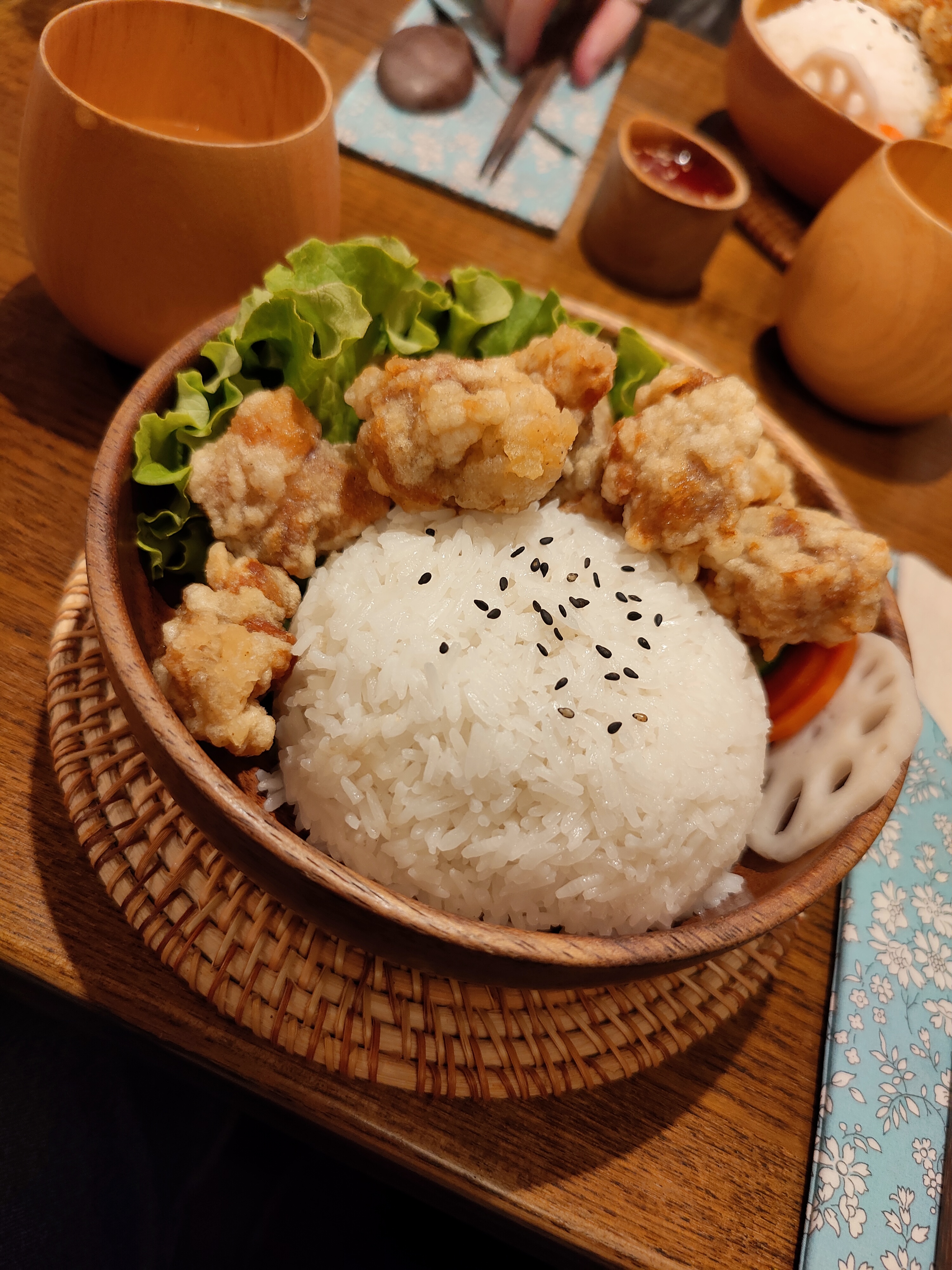 Je suis venu ici pour le déjeuner et c'était délicieux. Ils ont préparé un menu pour le déjeuner comprenant des légumes bouillis, une boisson et un apéritif, pour lequel j'ai commandé le gyoza aux légumes croustillant et léger. Cela m’a définitivement ouvert l’appétit. Parlons maintenant du bol de riz principal. Il y a un menu au KFC indonésien que j'adorais quand j'étais enfant et qui se compose d'un lit de riz chaud garni de poulet pop-corn et d'une sauce épicée qui utilise du ketchup comme base. Manger le bento au poulet frit ici me ramène à cette époque nostalgique, mais dans un sens beaucoup plus raffiné. Le poulet frit est si croustillant, il y a une généreuse quantité de riz pour s'imprégner de toute la richesse de la saveur et les légumes complètent la richesse des autres composants. Mon cœur était heureux de manger ça. Je reviendrai certainement ici.