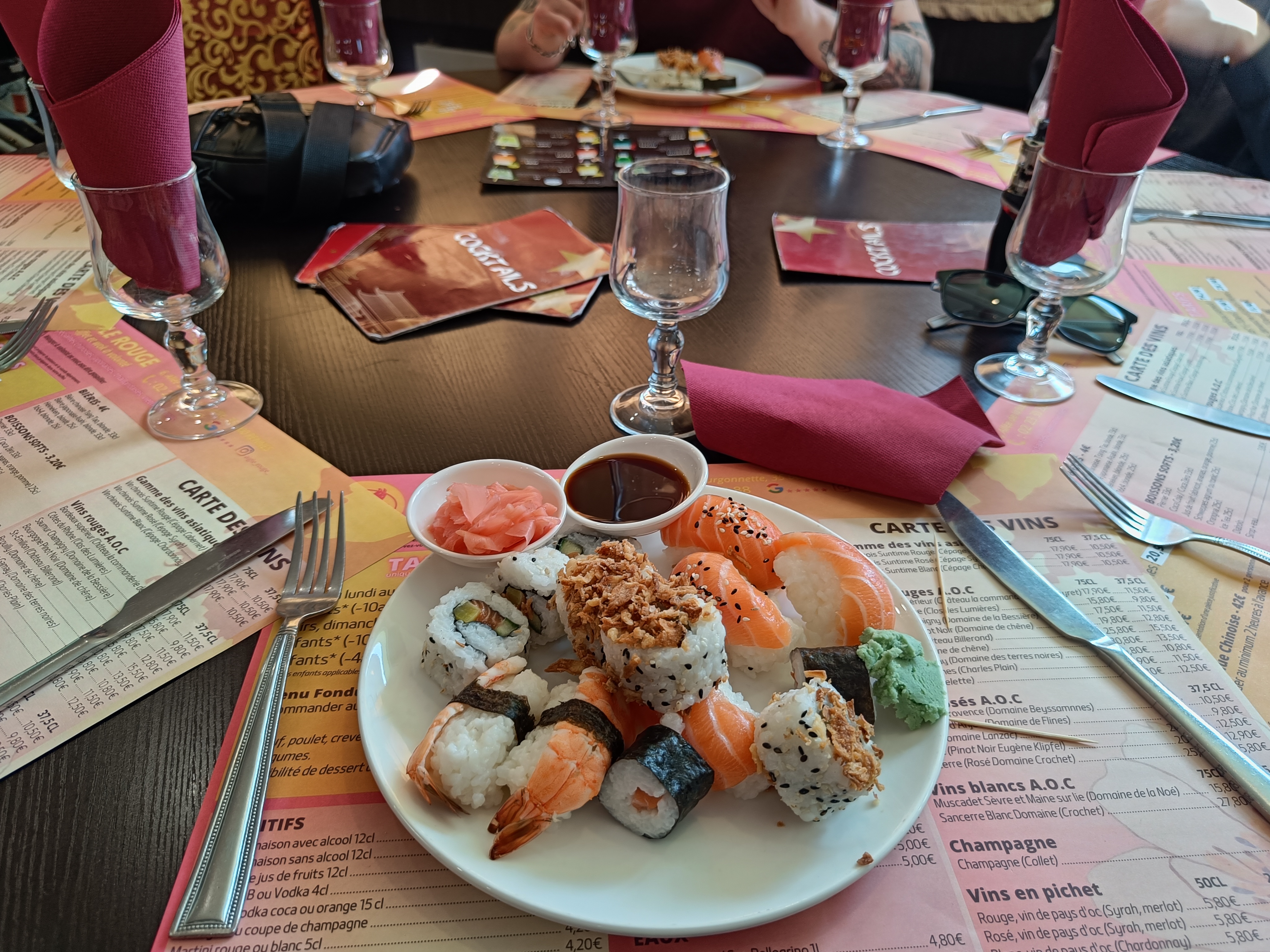 On a vraiment passé un bon moment en famille. Les plats y sont variés(chinois-thaï-japonais-sud est asiatique). Les ingrédients du Wok sont nombreux et frais.Tous les autres plats sont maintenus au chaud et régulièrement ravitaillés en cas de manque.Un gros choix de sushis, makis,ravioles... Le tarif du soir et week-end 16€90 par adulte, un peu cher,mais quand on voit le choix du buffet,on comprend mieux.