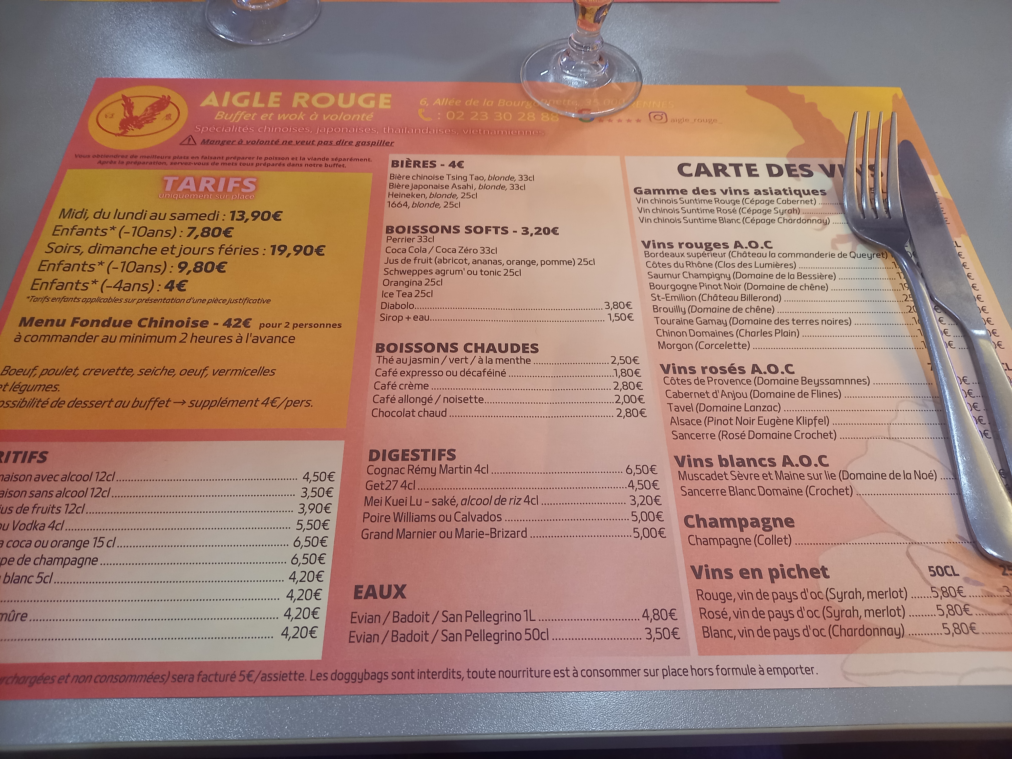 Restaurant situé dans le Sud de Rennes au croisement entre le quartier de la poterie, Chantepie et Cesson. Rien d'originale: c est un buffet a volonté, qui respecte les classiques du genre. L accueil est souriant et agréable. Pour les afficionados de ces formules, le restaurant se situe dans le haut du standard. Choix bien évidemment fournis et variés ( c est le principe de la formule). En revanche, niveau dessert, l'Aigle Rouge se distingue de ses concurrents avec un assortiment d entremets, et un TRÈS large choix de desserts. Le petit plus, c est un robot qui vous apporte l'apéro. Et a voir la tête des enfants, l effet est garanti.