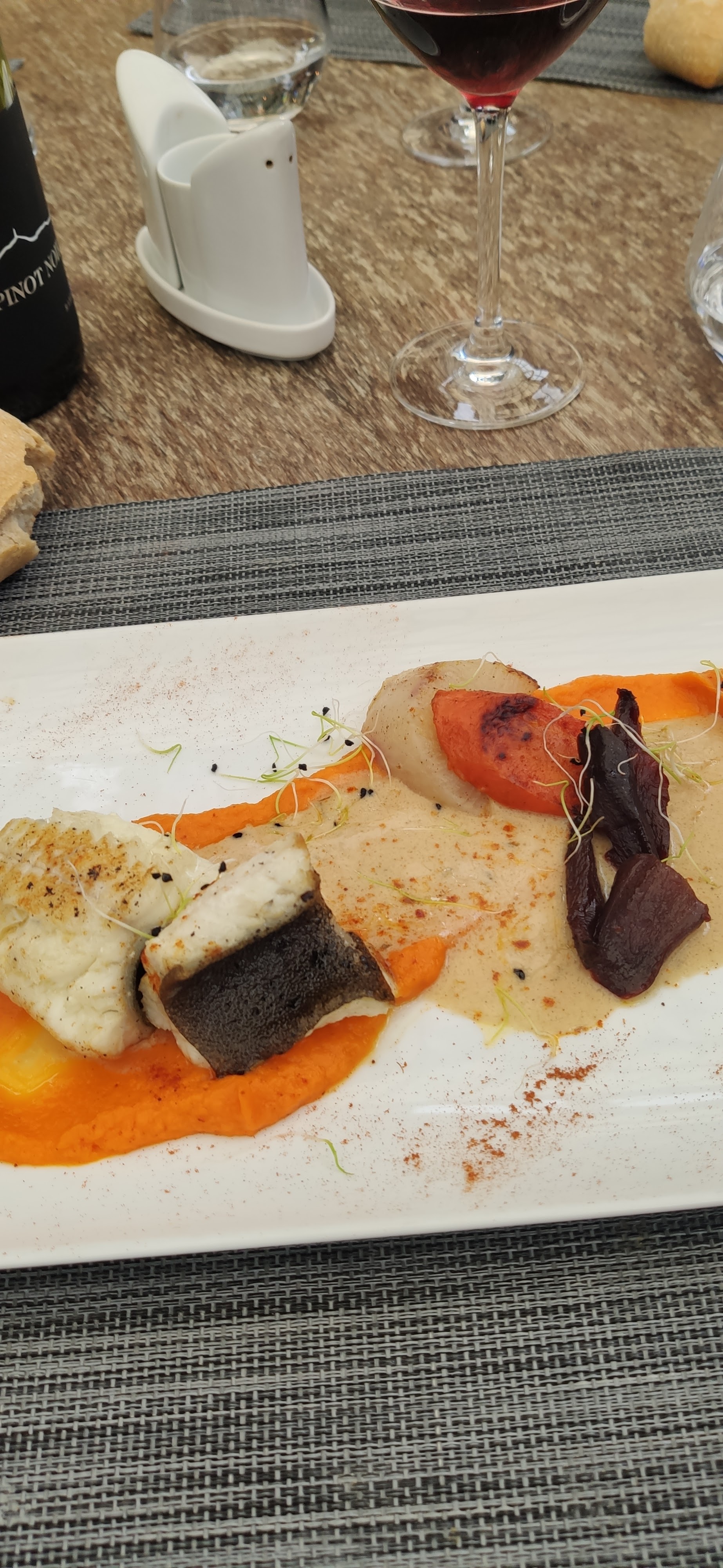 Cadre très agréable, rien à redire sur le service. Par contre le repas, inacceptable Un filet de bar sauce mousseline... 25,50 euros. Filet très certainement décongelé, pas cuit, mais presque grillé, avec une purée mousseline, quelques rondelles de carottes. 25 euros. Cela ne valait pas plus de la moitié. Goût industriel,.. Je me suis senti escroqué Et je ne vous parle pas du café gourmand, qui n'avait rien de gourmand. Et pour clôturer, des toilettes jonchées de papier toilettes et de flaques.... Au final continuez votre route, ou allez ds les restos voisins.