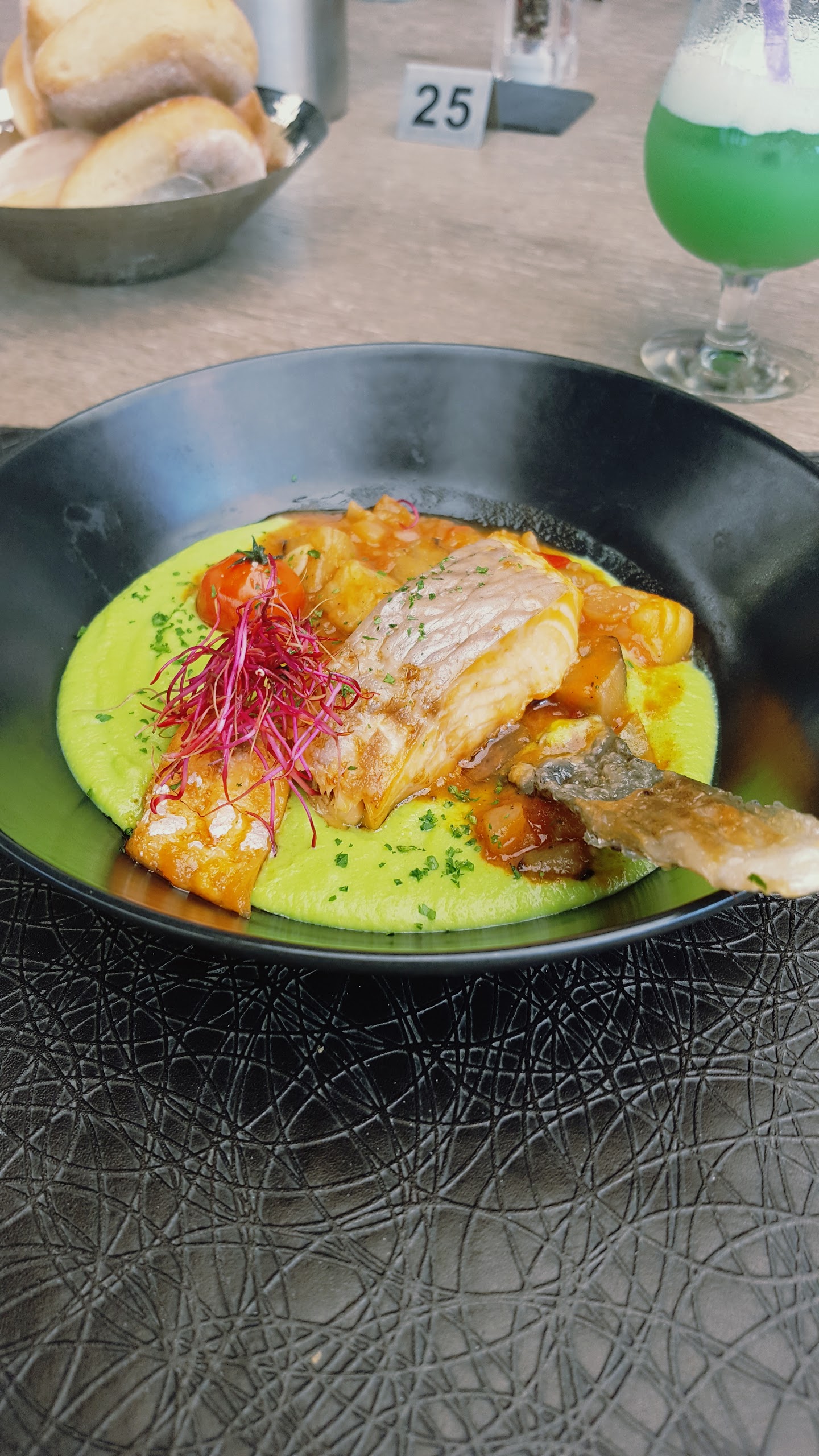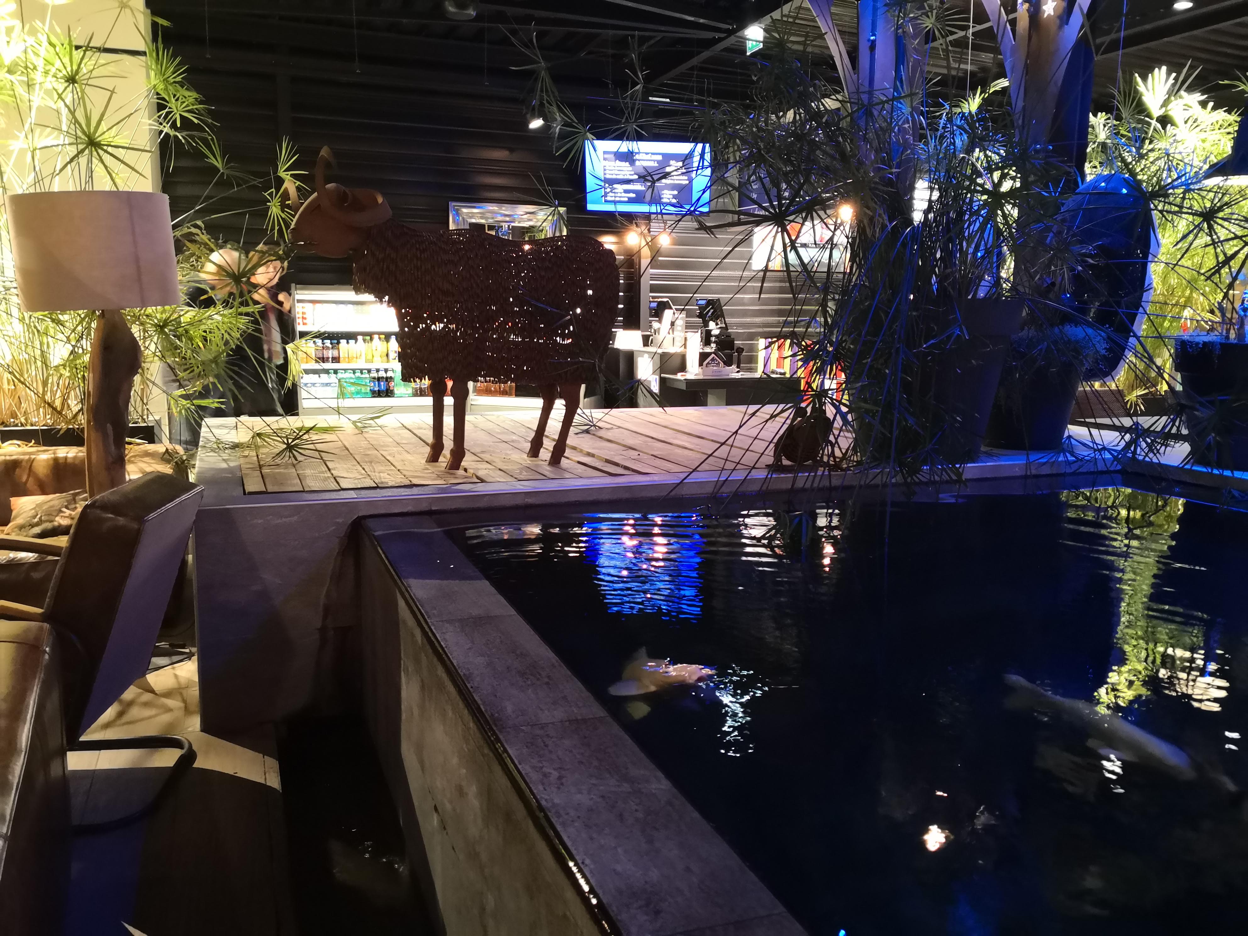 On se sent bien dans ce lieu, nous avons passé un moment au coin bar lounge avec des canapés à côté de la grosse piscine pour poissons. Puis resto routier qui est très bien organisé, choix entre 3 entrées ; plats ; desserts. C’est efficace, assez bon et rapide. On a kiffé le serveur qui des notre arrivée nous a bien accueilli et qui a une sacré pêche, au top !