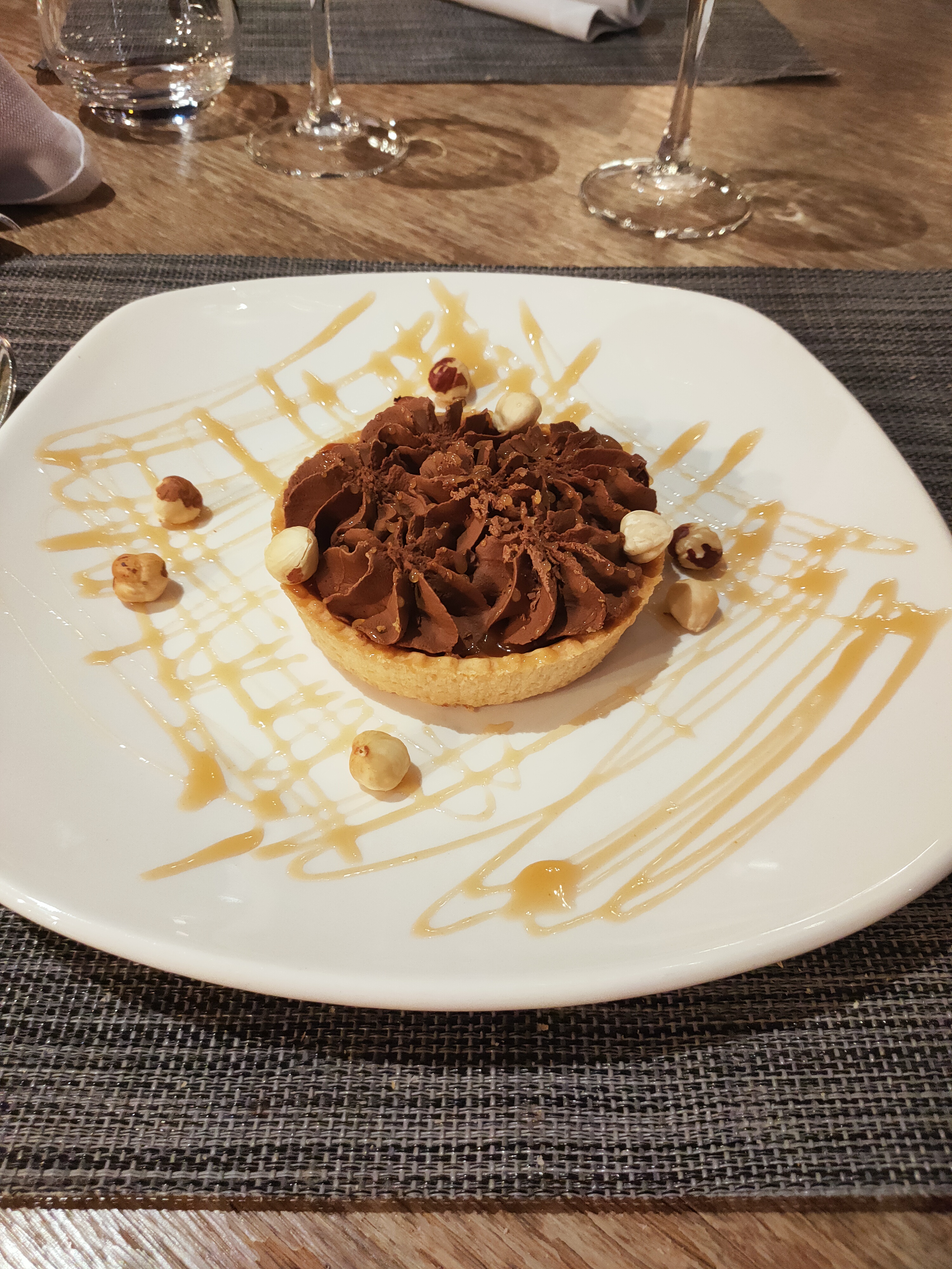 Le cadre agréable n est pas en adéquation avec la qualité des plats. Un menu à 48e avec beaucoup trop de raté. Le foie gras poêlé n avait rien d un foie de qualité. Au lieu d une belle tranche vous aurez 3 morceaux de 4cm dans votre assiette. Le plat fut très bon copieux et de belle qualité. La déception fut totale au dessert av un gâteau au chocolat incoupabe L assiette est retournée au chef la réponse : c est une volonté du chef que ce soit très très dur.... un bronie a été servi en remplacement qui était très sec... Le café a été offert en compensation mais dans l ensemble le prix méritait autre chose. Nous sommes vraiment loin d un restaurant gastronomique. Il faut revoir les tarifs ppur les soirées spéciales. Sinon.le personnel est agréable et professionnel. Dommage