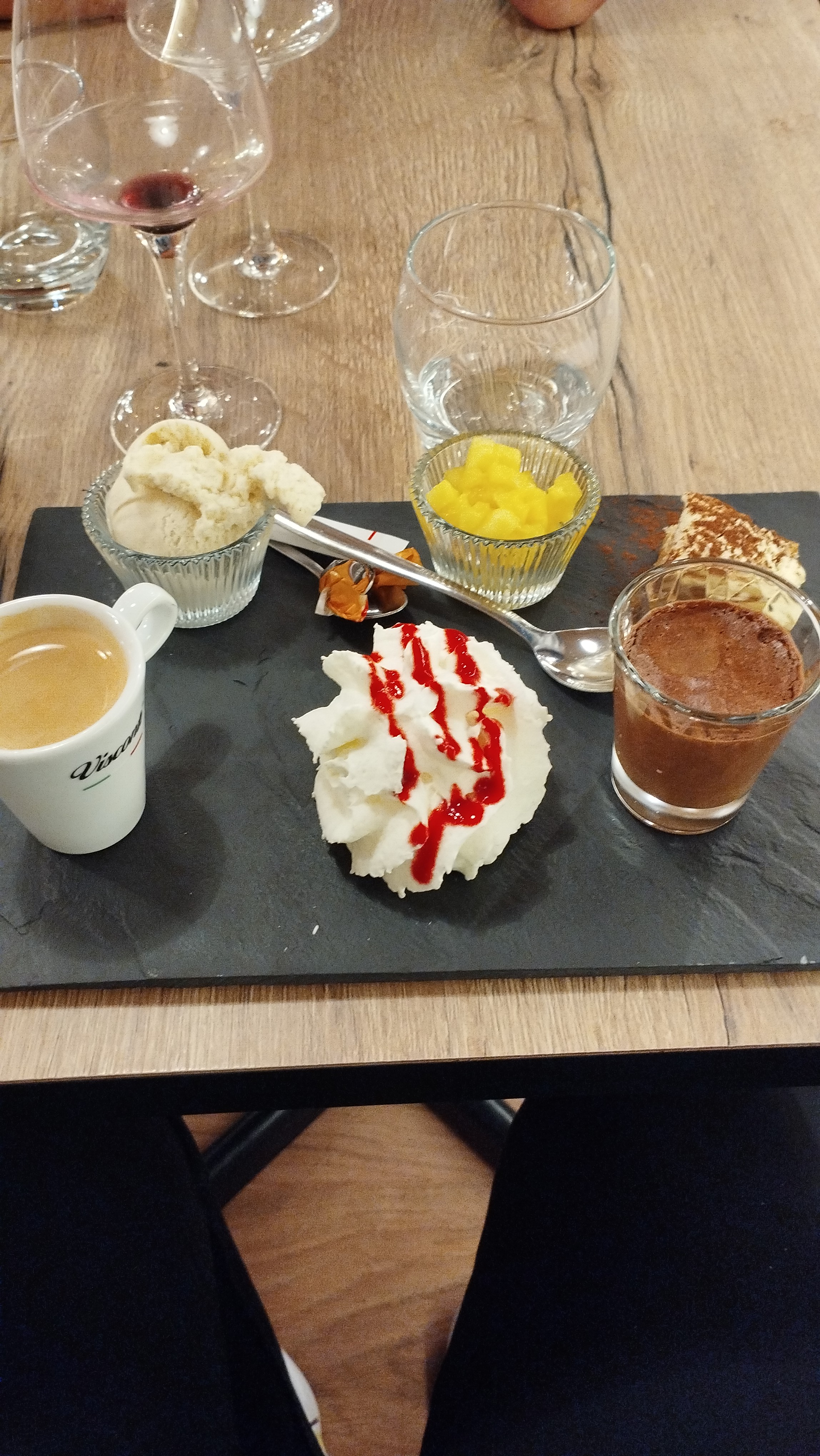 Bonjour, repas entre amis, deco très chouette en palette, personnels sympathique, je dirais juste un peu trop copieux... je n avais plus faim pour le dessert alors que j avais vu un café gourmand, tant pis pour moi, mais très bon rapport qualité prix.