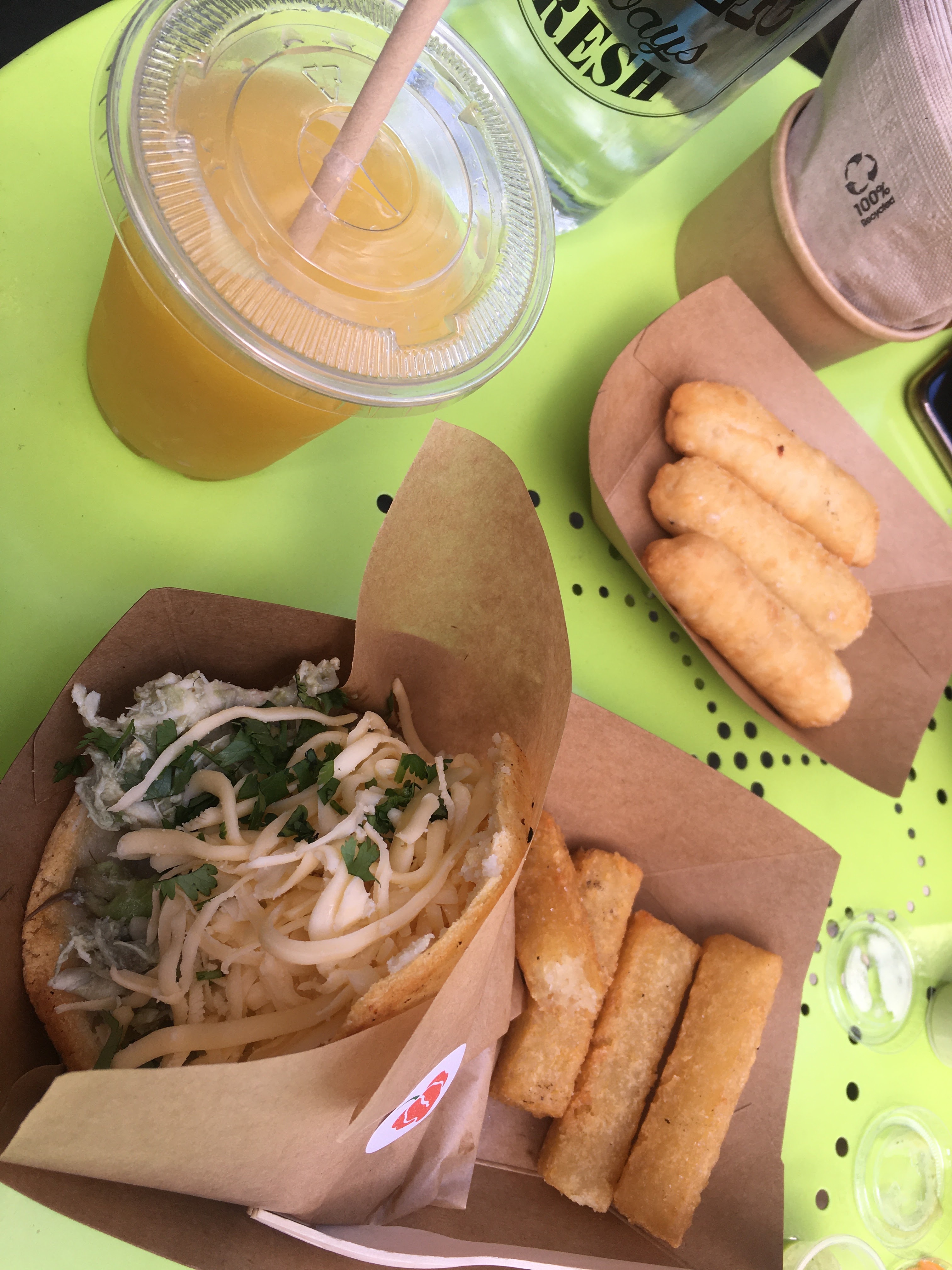 Arepa rapide et facile, idéal pour les déplacements. Aussi quelques sièges disponibles. De grandes portions ! Du jus de mangue frais !