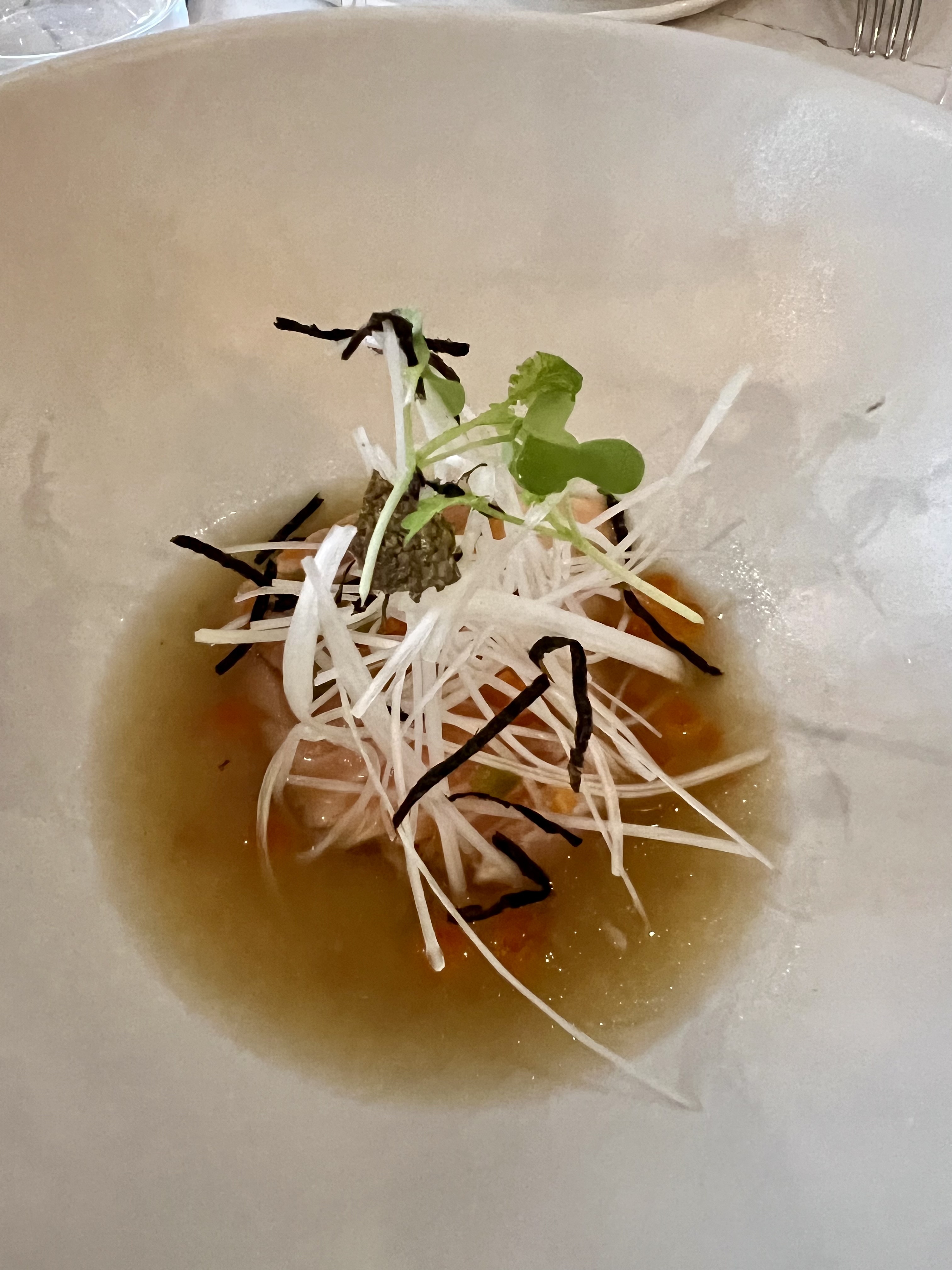 Service et nourriture incroyables! J'ai adoré la façon dont ils ont incorporé des éléments japonais et français (ingrédients, techniques, etc.) dans le menu de dégustation. L'expérience dans son ensemble a été formidable et j'adorerais revenir la prochaine fois que je serai à Paris pour voir quels autres éléments sont en dégustation !