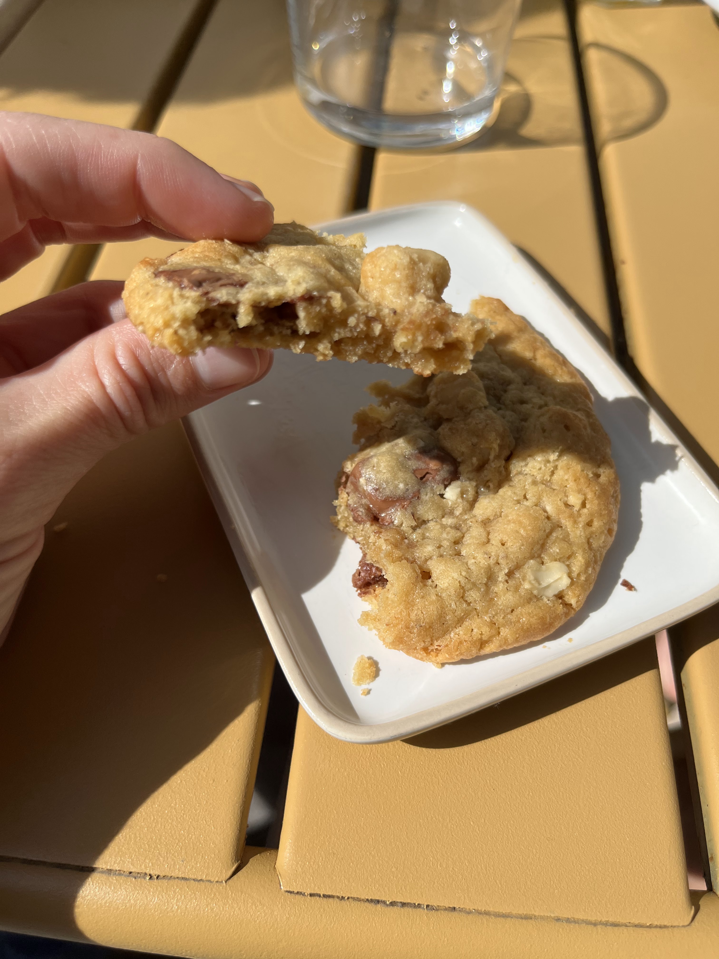 Trouvé au hasard et quelle bonne surprise ! Excellent blanc plat, je ne m'attendais pas à trouver ça ici. Super cookie à l'américaine et bon gâteau aux carottes.