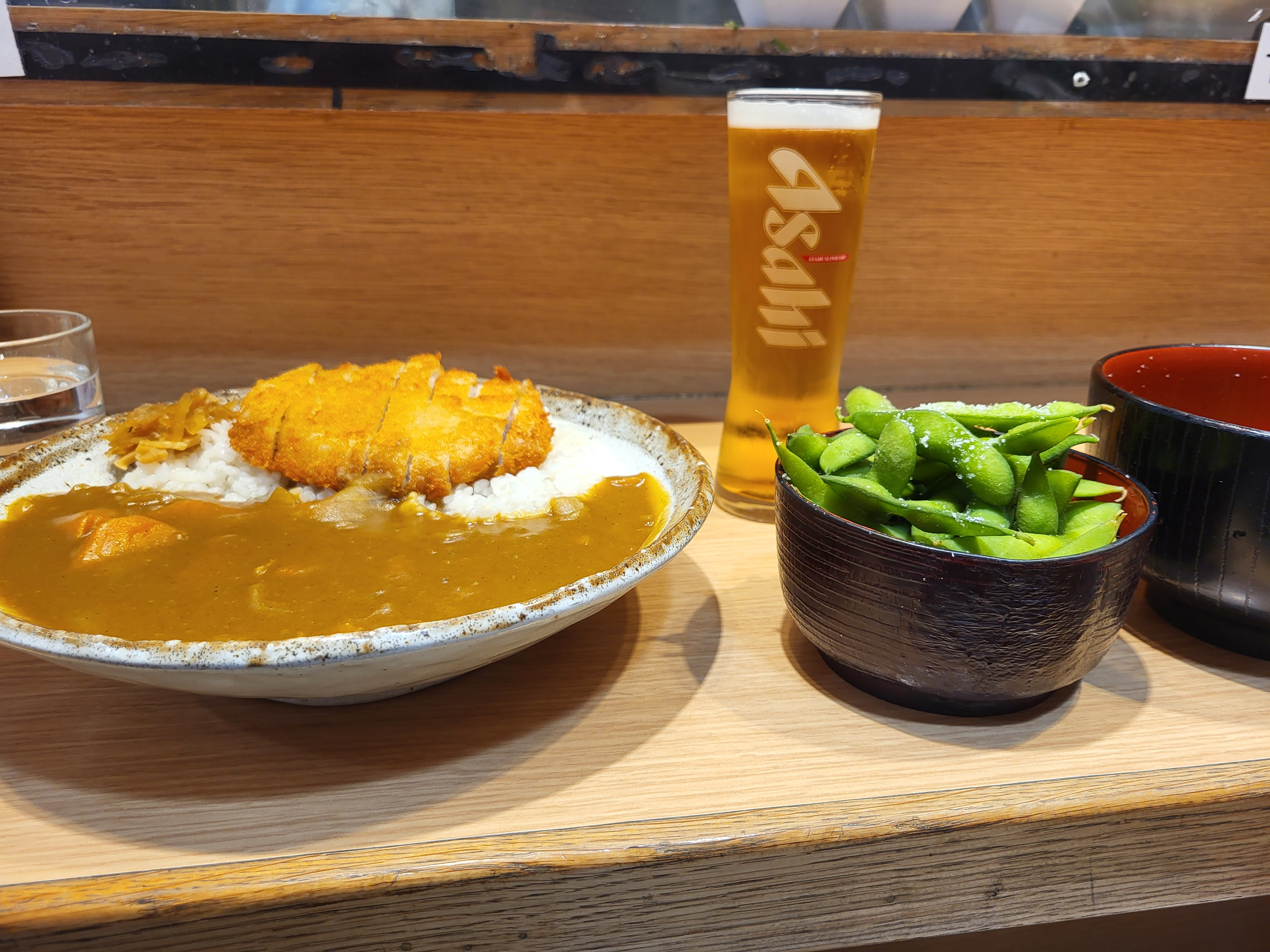 Super bonne bière pression, matcha glacé parfait. Curry de poulet parfait (j’aurais juste retiré le porc de la sauce ou le mettre en option)