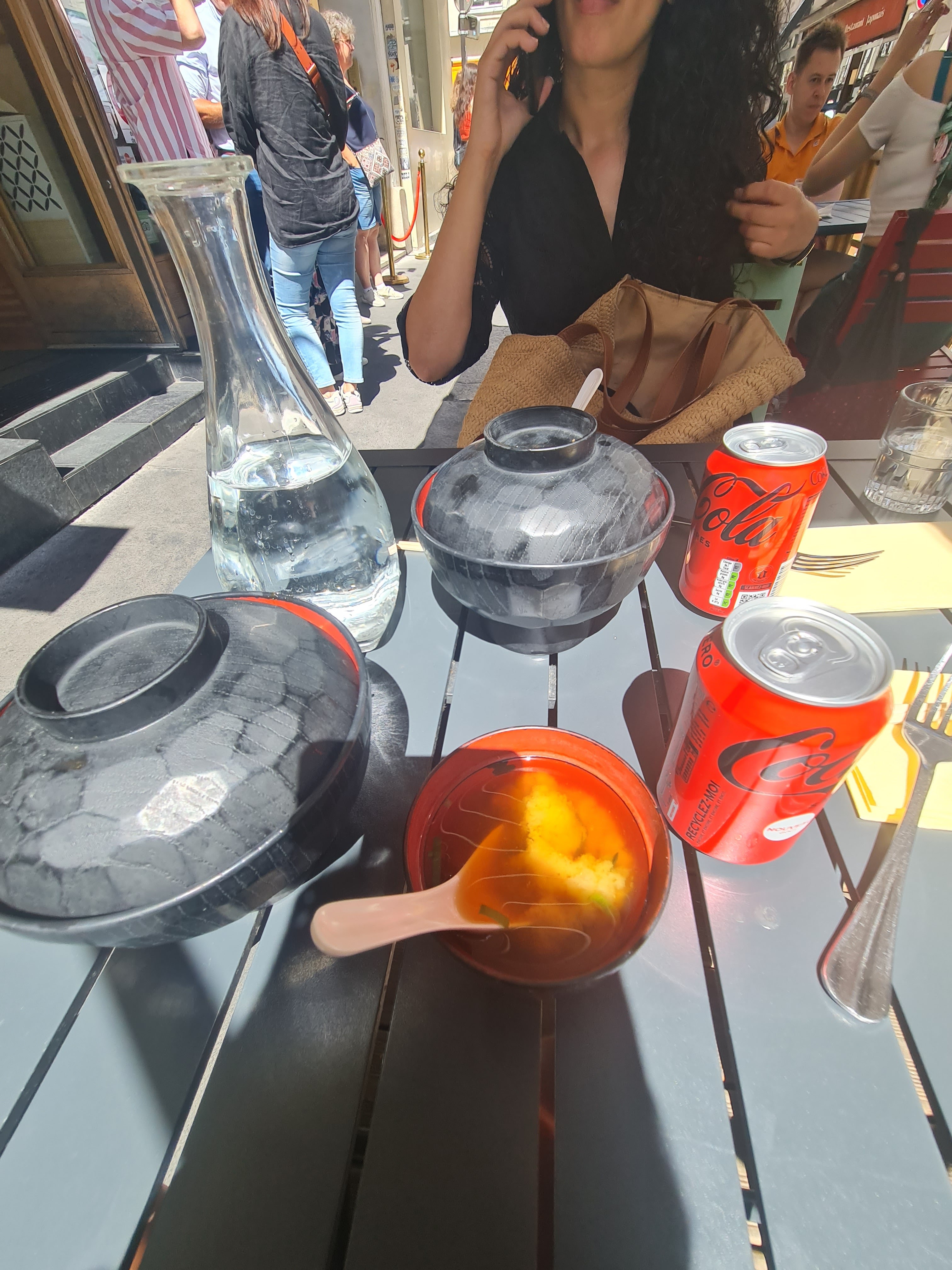 Resto rue sainte Anne avec beaucoup de queue, on a eu la chance d avoir une table pour 5 car venus quasi a l'ouverture de midi On a pris les Soba, les currys, le tofu, n'ayant pas pris des crêpes car déçu par le passage précedent. Les plats sont entre 14-16€, assez copieux, on a très bien aimé. Les Soba sont très bons, nouilles et bouillon. Le curry assez ordinaire mais ça nourrit bien On est après allé chercher les mochis en face. Car on était vraiment très serrés dans le restaurant et avoir la foule qui nous regarde manger n est pas très agréable. Ça reste un resto que je recommande