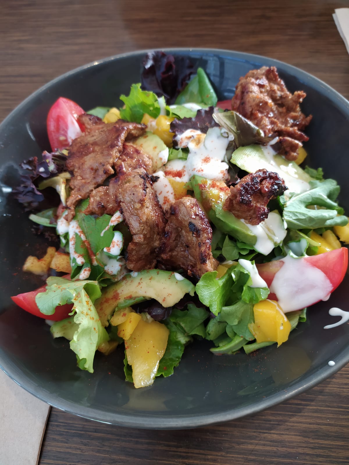 J'ai bcp aimeé leur salade au boeuf chaud, Avocat, salade verte et Le plat du poulet au légumes. J'ai gouté également le magret que mon fils avait commandé.j'ai aimé cette sauce à l'arachide . Je trouve qu'il y a un bon rapport qualité prix. Je retournerai certainement.