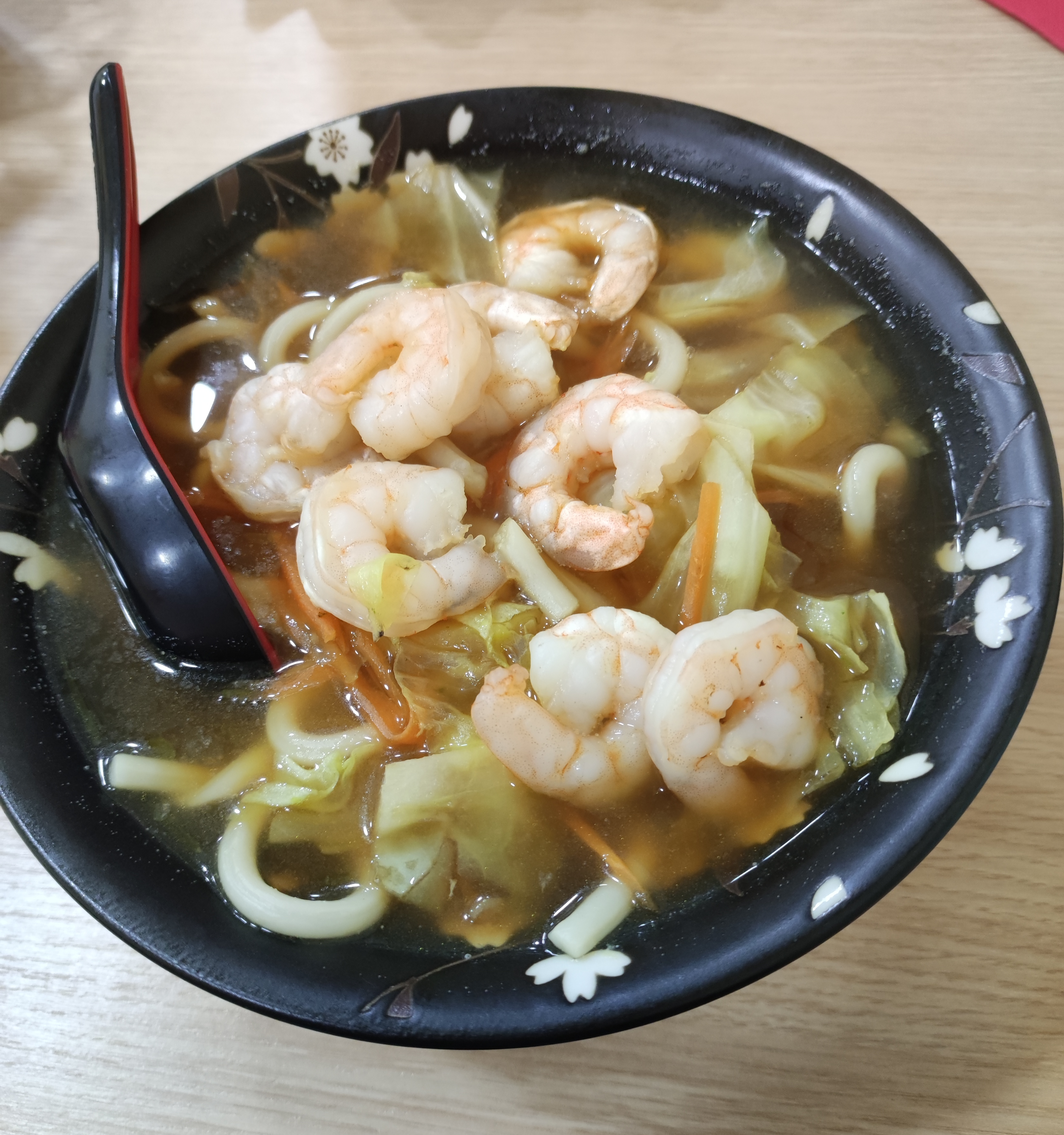 Nouilles aux crevettes ,soupe aux champignons ,saumon ,poulpe tout est excellent chez Akio